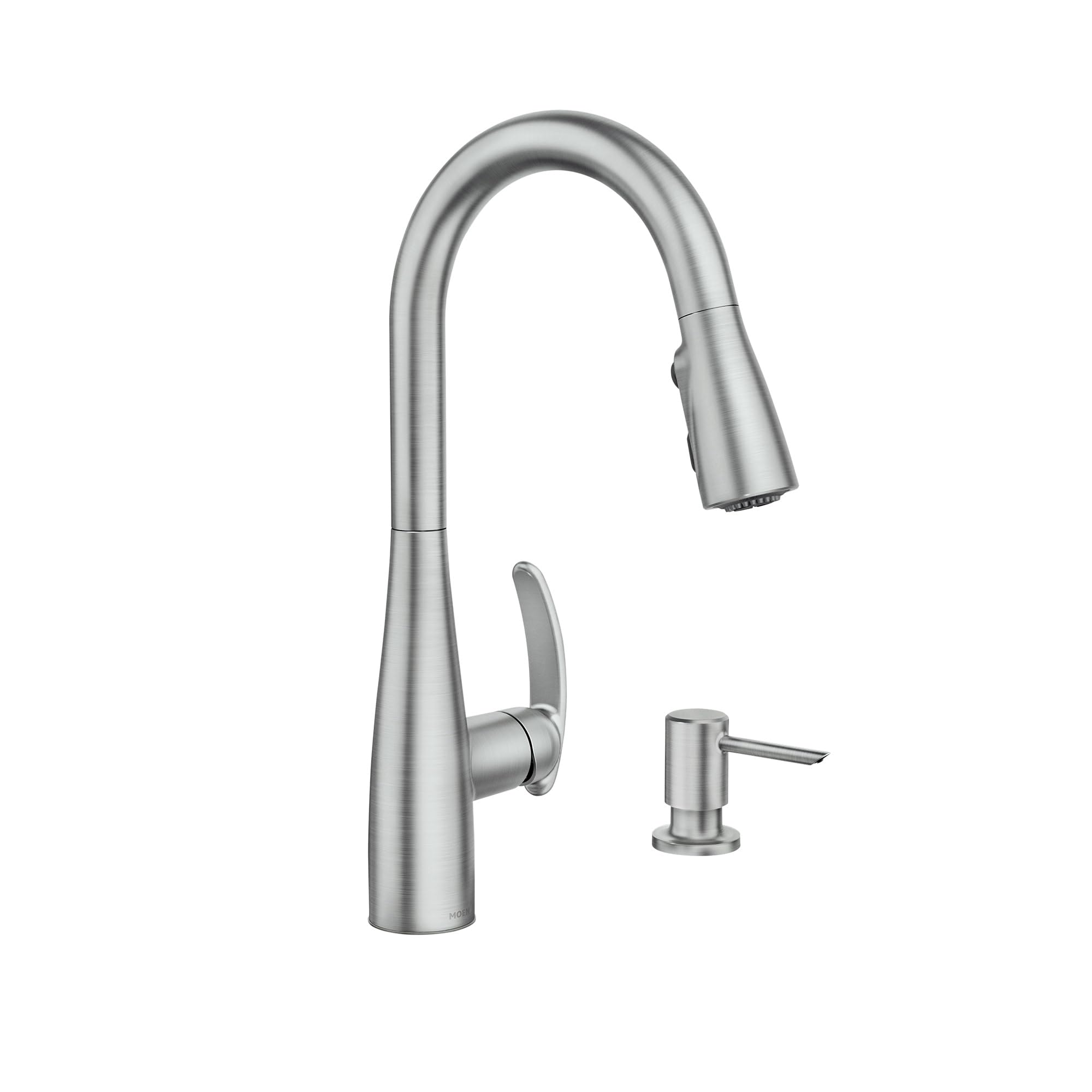 Image: The Moen Reyes 87932SRS Pulldown Kitchen Faucet in Spot Resist Stainless finish, showcasing its high-arc design and integrated soap dispenser.