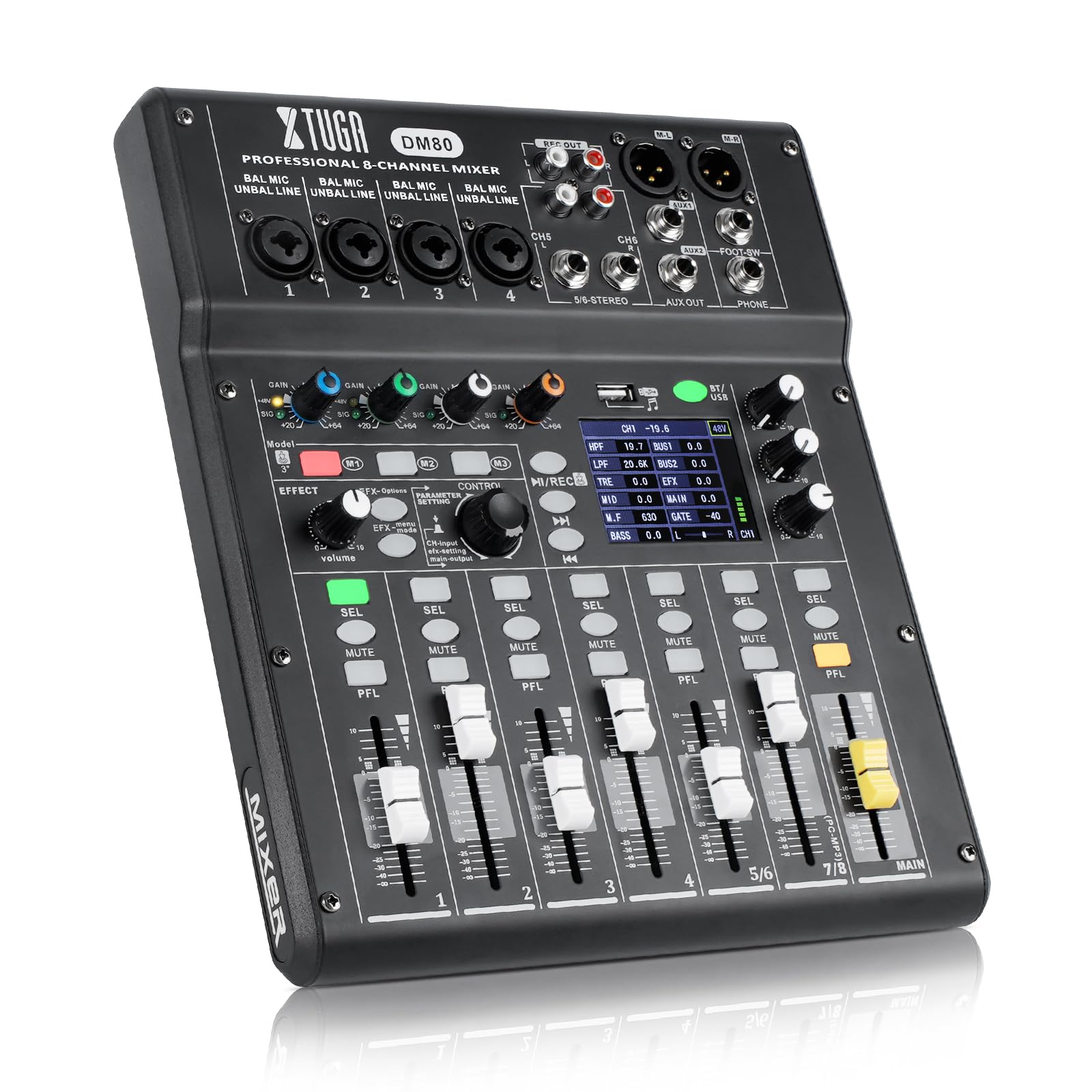Figure 2: XTUGA DM80 with key features such as 48V phantom power, EQ, 16 DSP effects, and recording capabilities.