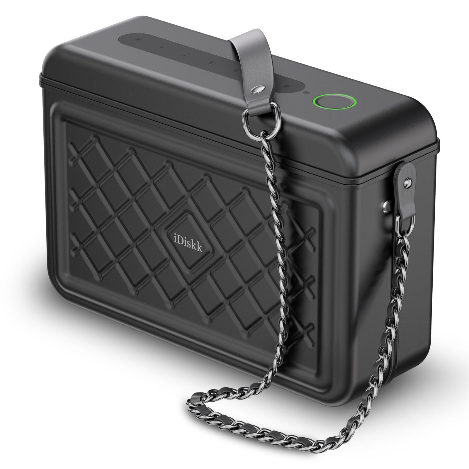 The iDiskk SafeBag11-PB-Box-B features a robust aluminum alloy and ABS construction, providing a secure enclosure for your valuables. It includes multiple compartments for organized storage and an integrated power bank for charging your devices.