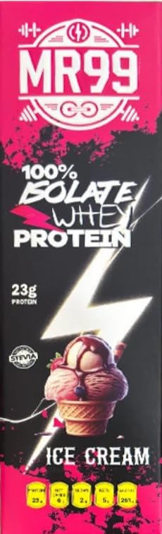 The MR99 Protein Bar is a nutritional supplement designed to provide a convenient source of protein. Each bar weighs 70 grams and contains 23 grams of protein, featuring an ice cream flavor. This product is supplied in a box containing 12 individual bars.