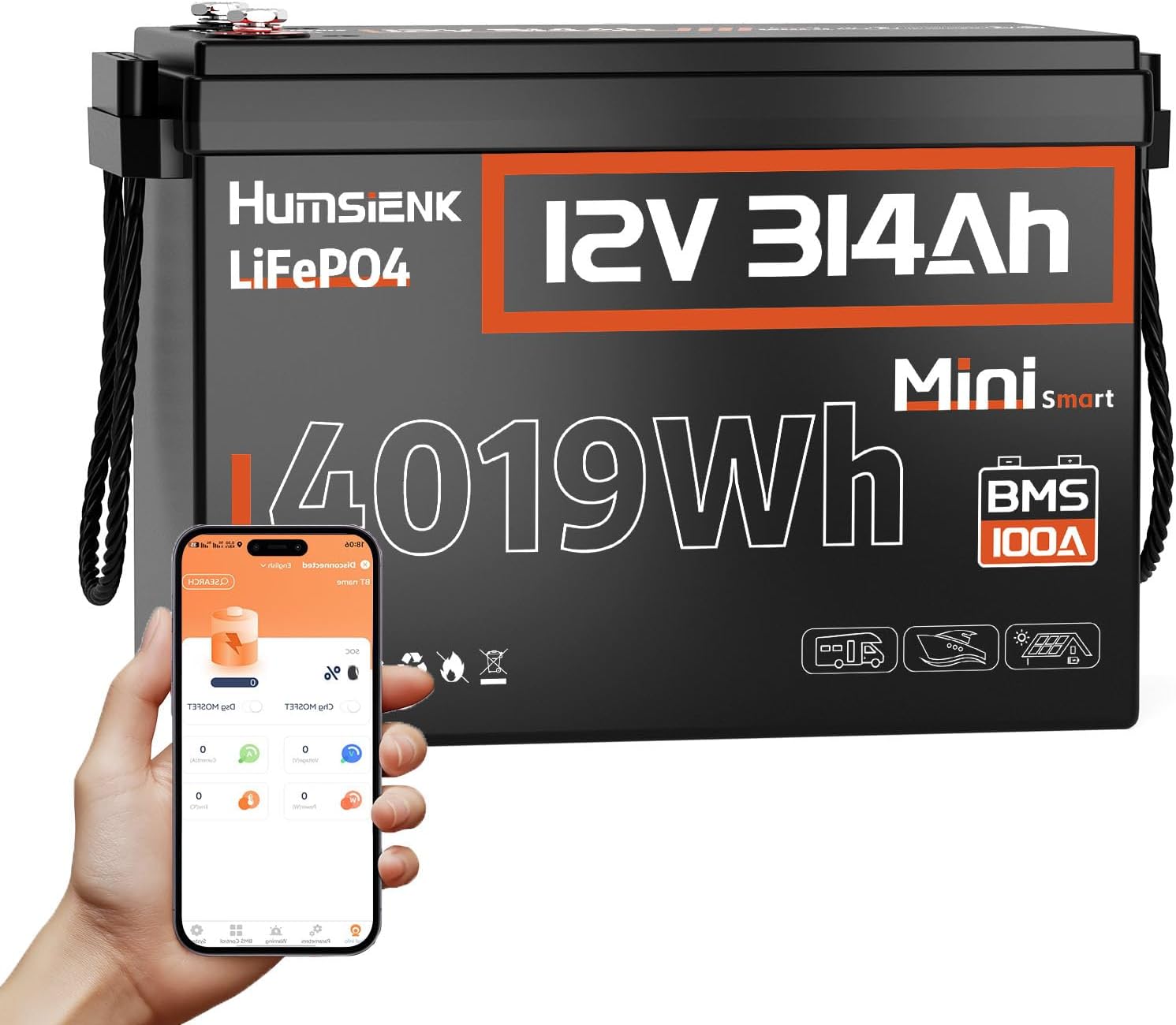 The HumsiENK 12V 314Ah LiFePO4 Lithium Battery MINI, showcasing its compact design and the Bluetooth app interface for real-time monitoring.