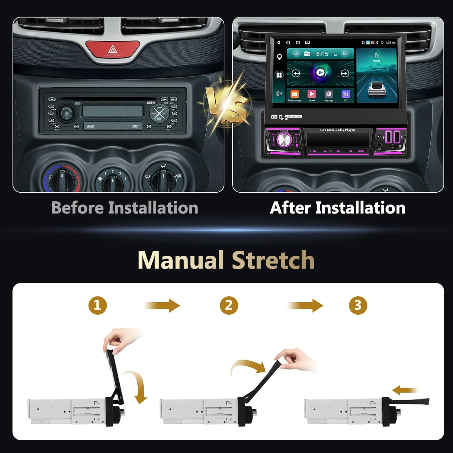 This image illustrates the visual transformation of a car's dashboard from a standard radio unit to the Roinvou 1 Din car stereo with its 7-inch retractable screen. It also demonstrates the three-step manual process for extending and retracting the screen.