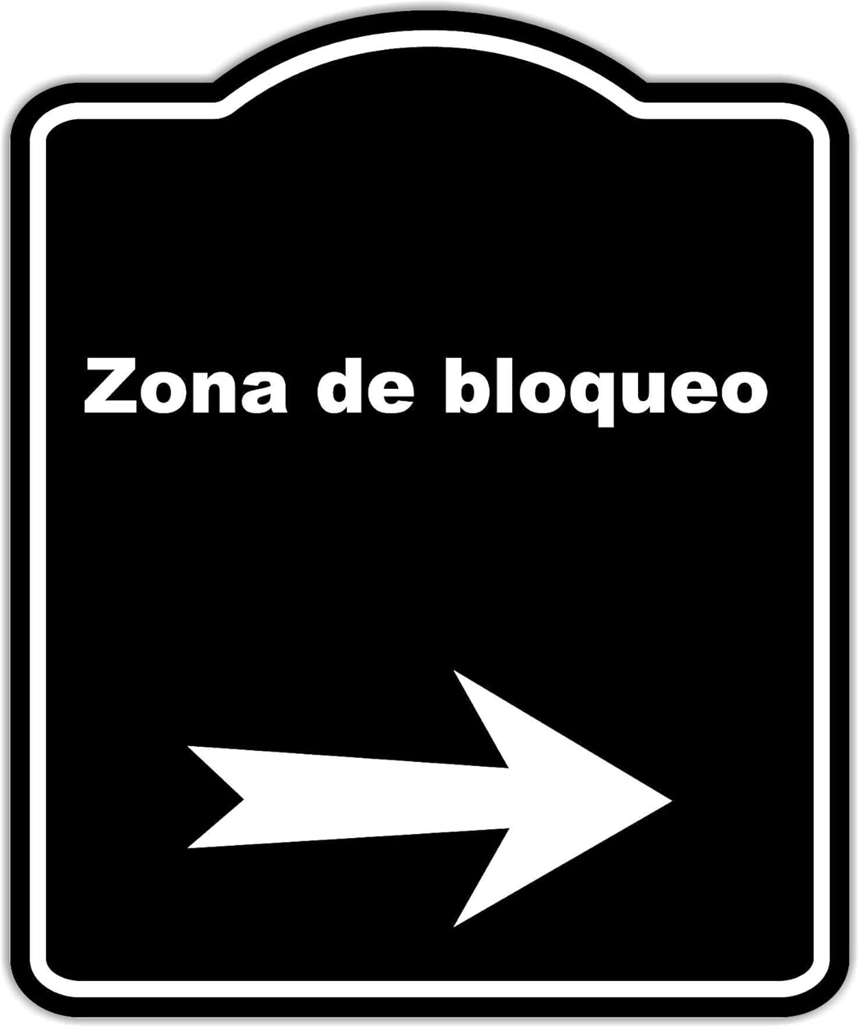 Image Description: A black sign with a white border. The text "Zona de bloqueo" is prominently displayed in white at the top, with a white right-pointing arrow below it. This image shows the primary design of the sign.