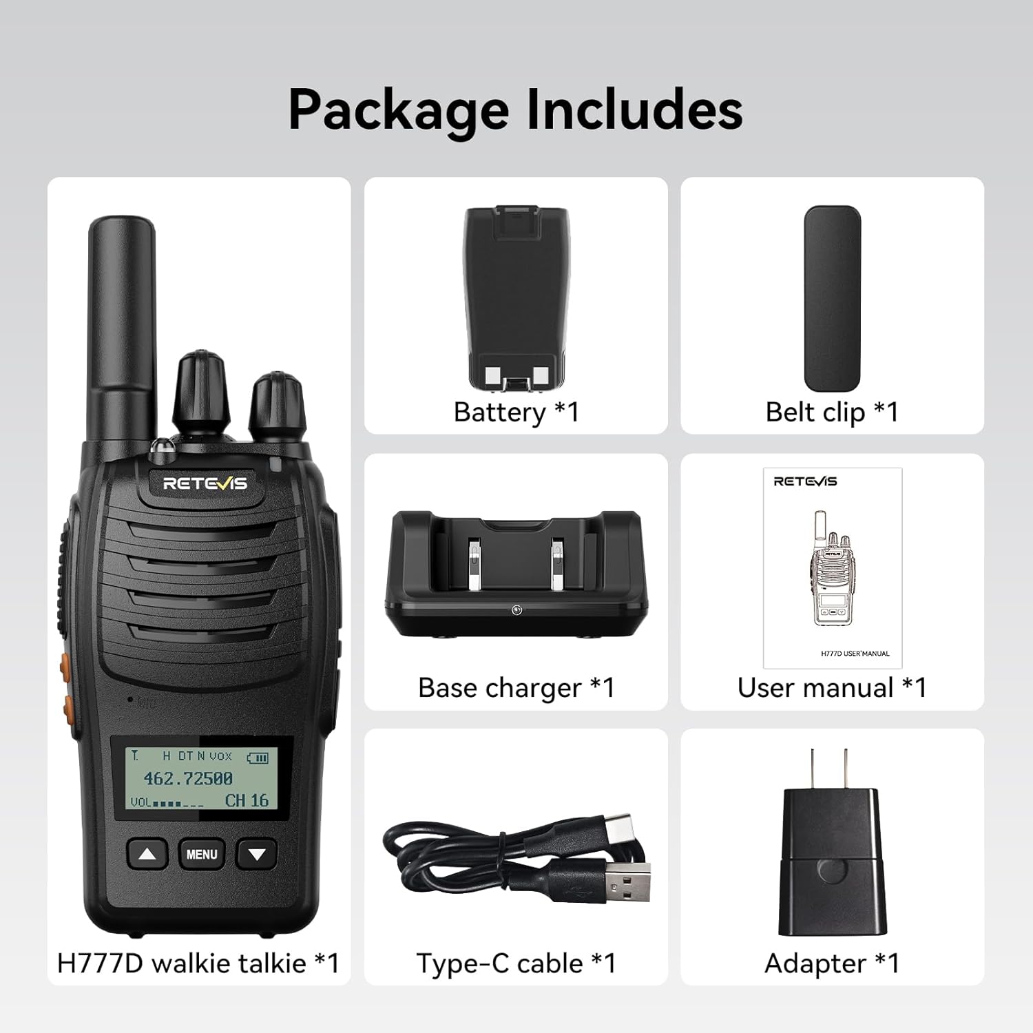 Upon unpacking your Retevis H777D Walkie Talkie, please ensure all the following items are present: