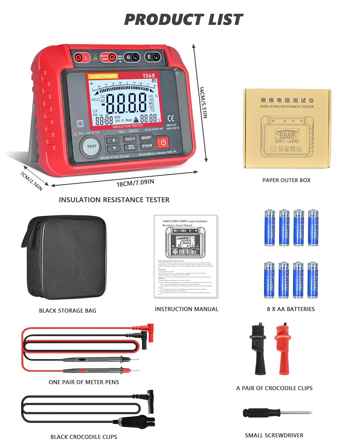 - 1 x GOLDCHAMP GC-T0-TS68 Megohmmeter