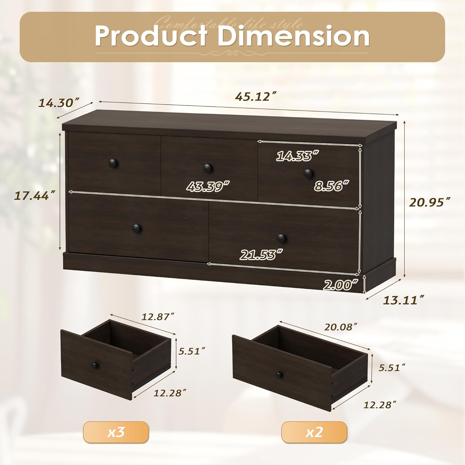 - Storage Capacity: The dresser features three smaller top drawers and two larger bottom drawers, suitable for various items such as clothing, accessories, books, or office supplies.