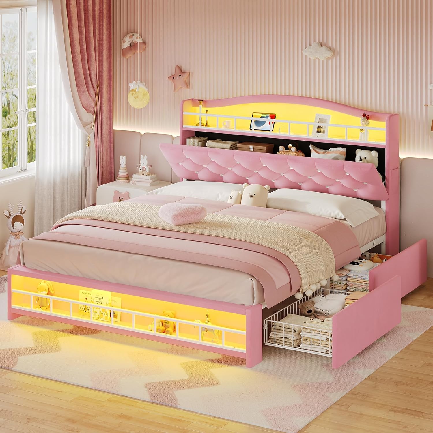 Image: The BTHFST Full Bed Frame in pink, showcasing the storage headboard, LED lights, and under-bed drawers.