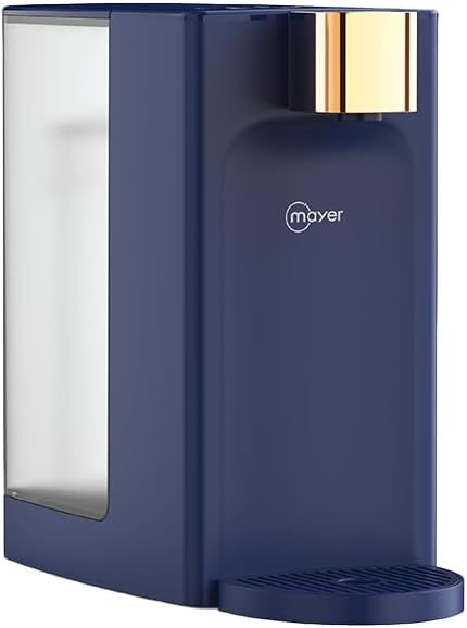 This image shows the Mayer 3L Instant Heating Water Dispenser from an angled perspective, highlighting its compact design and the transparent water tank on the side. The main body is dark blue with a gold-colored dispenser spout.