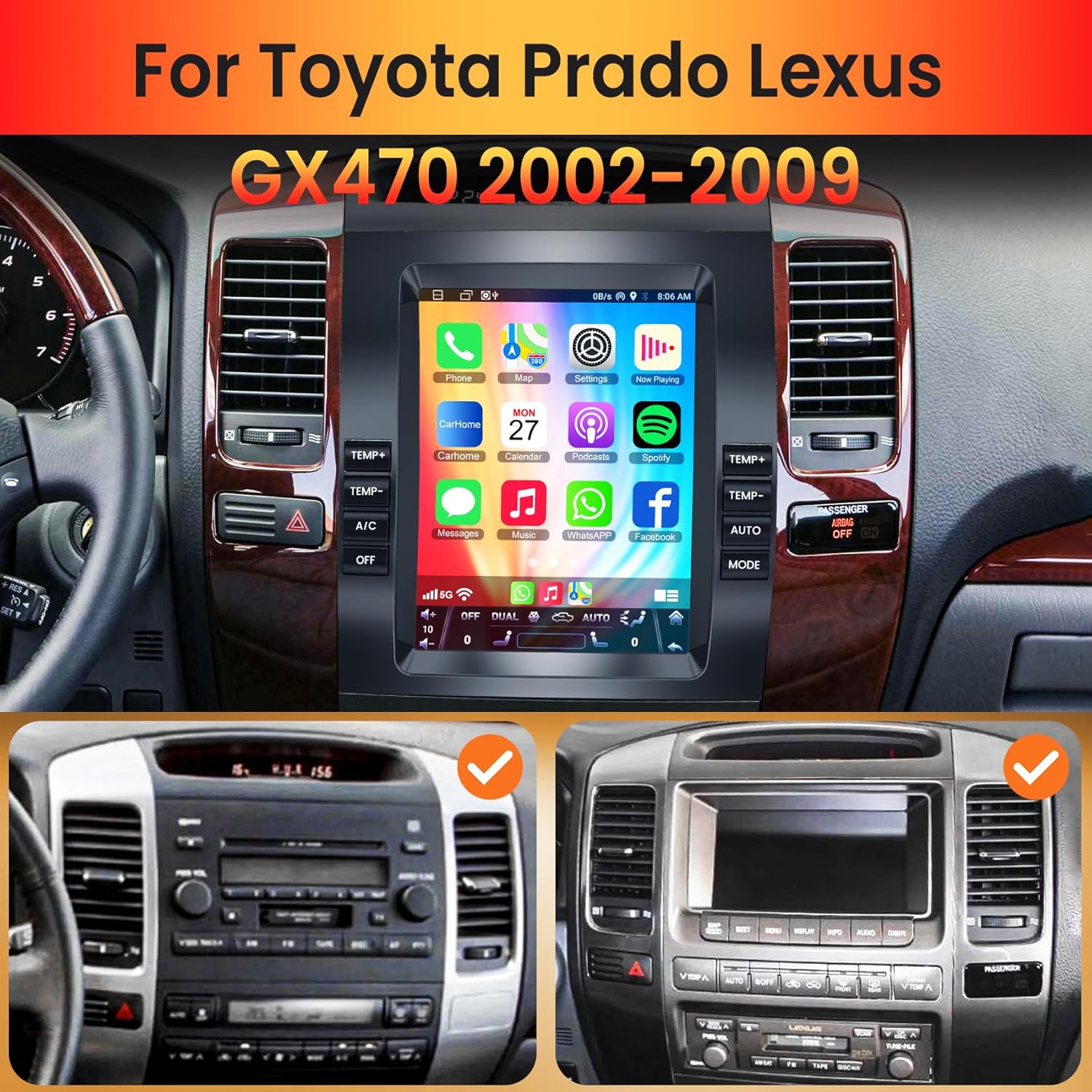 Image: The electrosmart 9.7 Inch Car Radio seamlessly integrated into a Lexus GX470 dashboard, demonstrating its fit and appearance within the compatible vehicle models.