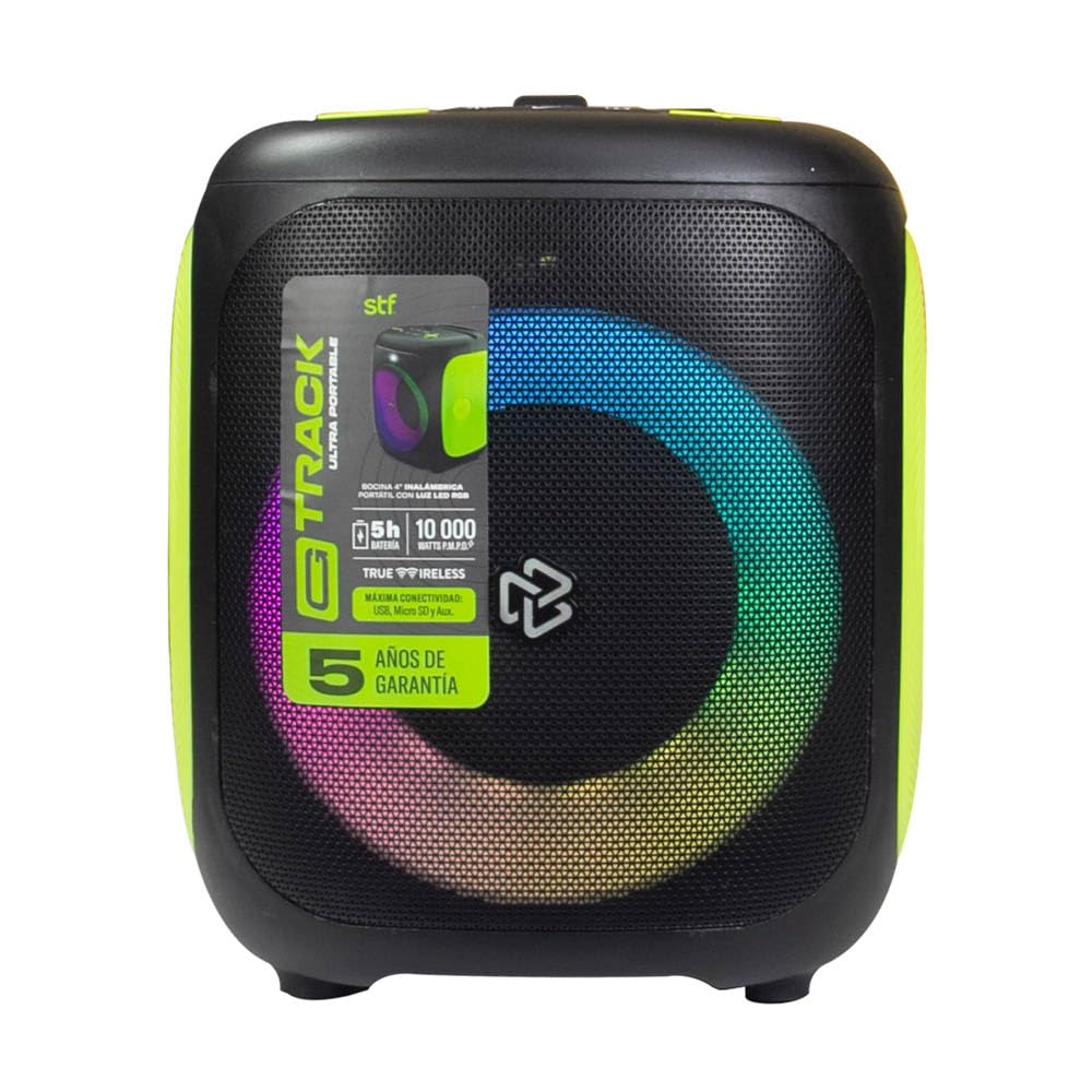 Thank you for choosing the STF G Track Ultra Portable Speaker. This manual provides essential information for the safe and efficient operation of your device. Please read it thoroughly before use and retain it for future reference. This portable speaker features a 4-inch driver, 20W output, RGB LED lighting, True Wireless Stereo (TWS) functionality, Bluetooth 5 connectivity, and multiple playback options including USB, Micro SD, Aux, FM radio, and microphone input.