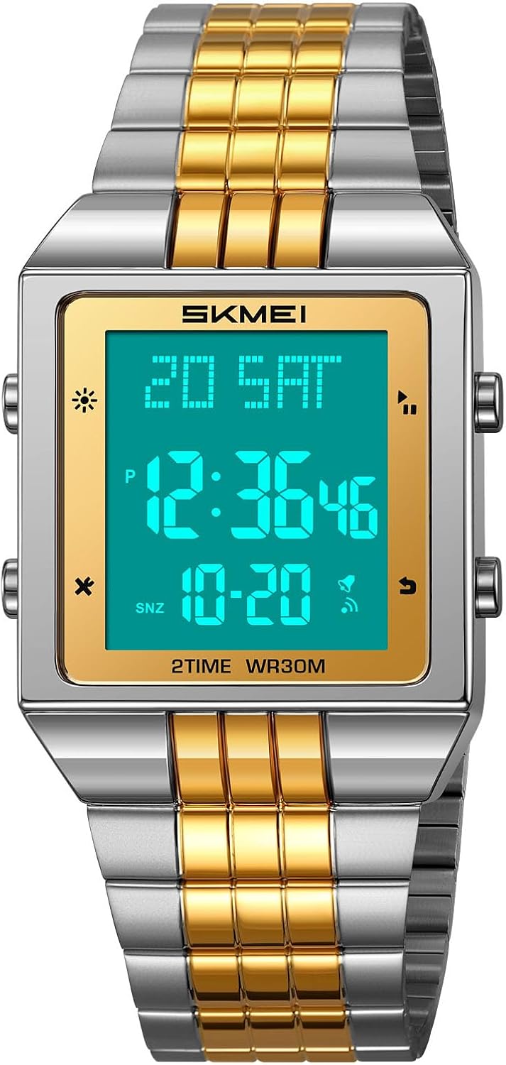 Front view of the FANMIS Classic Digital Sports Watch, showcasing its square digital display, gold-tone bezel, and two-tone stainless steel band. The display shows time, date, and day of the week.