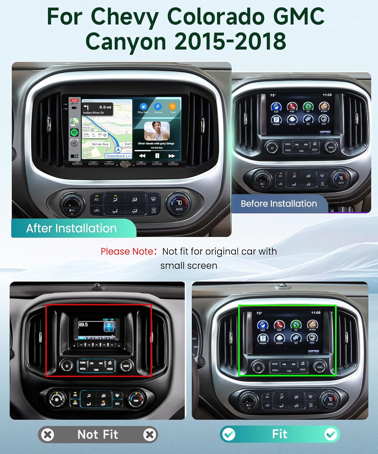 Image: Vehicle compatibility overview. This image illustrates the car stereo installed in a compatible dashboard (After Installation) and shows an incompatible dashboard with a small screen (Not Fit).