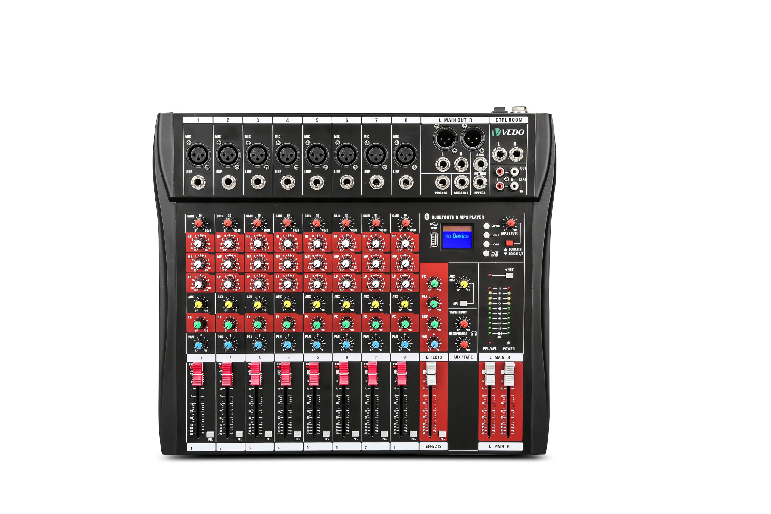 Image: Front view of the VEDO VDA208L 8-Channel Professional Audio Mixer, showing all controls and inputs.