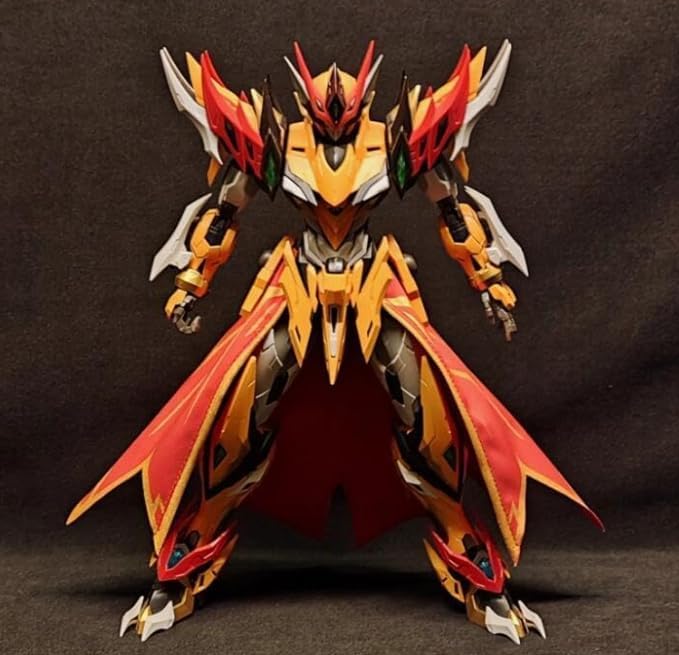 Image: The Motor Nucleartoys MNP-XH01 Yellow Dragon Model Kit with its distinctive red and gold cloak fully attached. This image displays the complete aesthetic of the model, highlighting the intricate design of the cloak and how it integrates with the dragon's form.