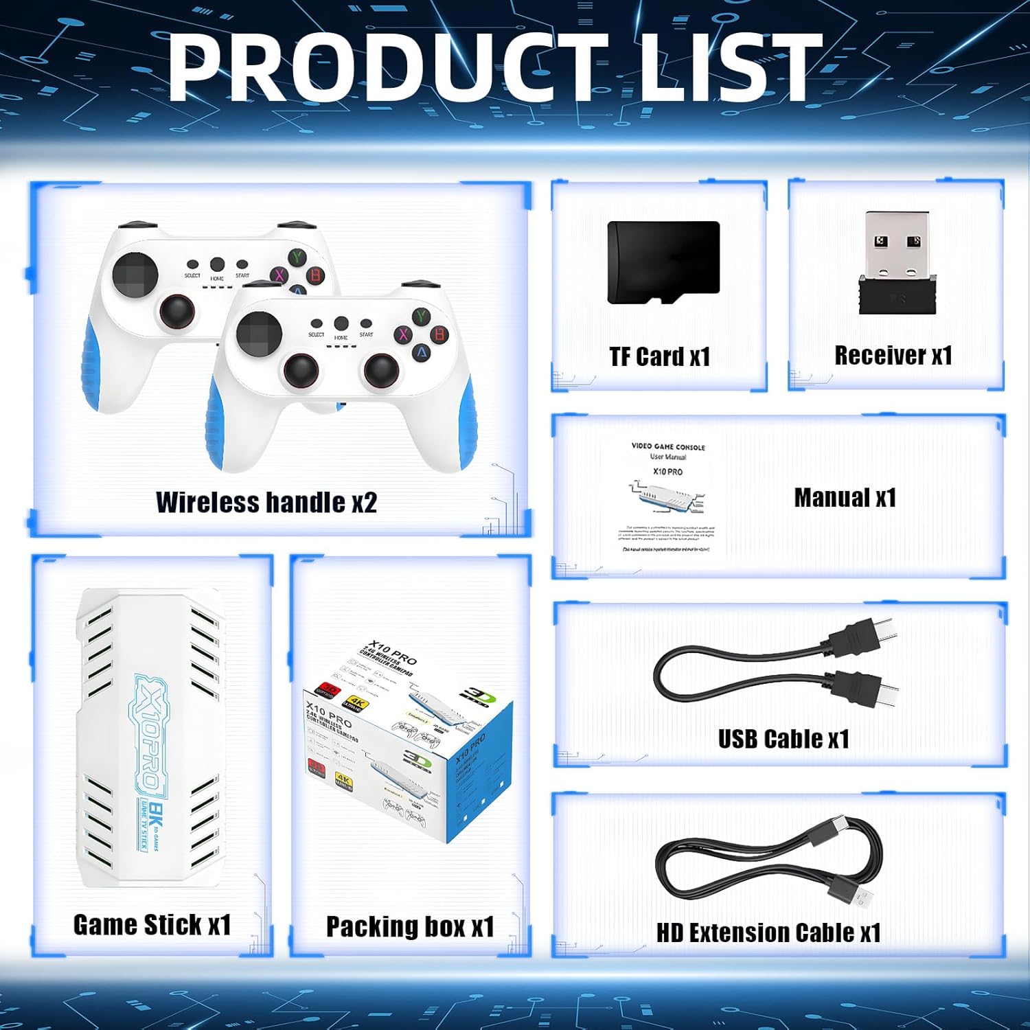 The X10 Pro Game Stick is a compact device designed for retro gaming. It connects directly to your TV via HDMI. The included wireless controllers provide an ergonomic design for comfortable gameplay, featuring personalized buttons, plastic material for reduced weight, all-region rockers, and a non-slip design.