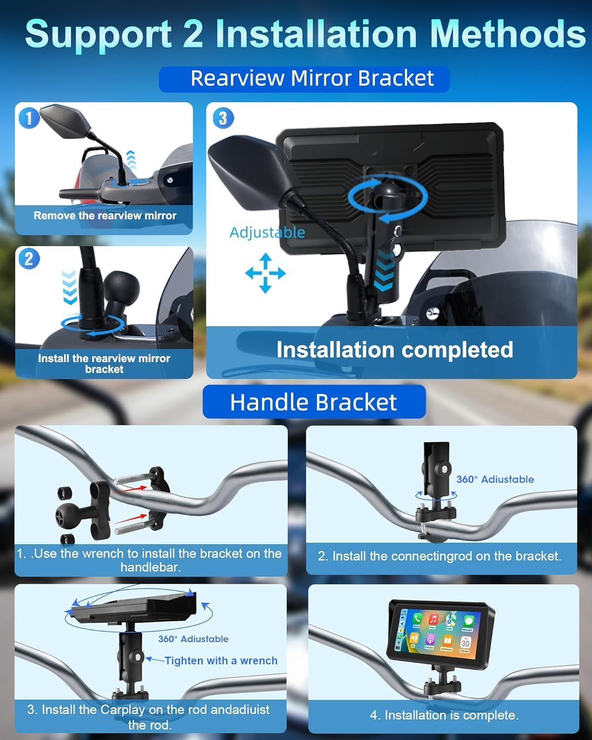 The device supports two primary installation methods: Rearview Mirror Bracket and Handlebar Bracket. Choose the method best suited for your motorcycle and preference.