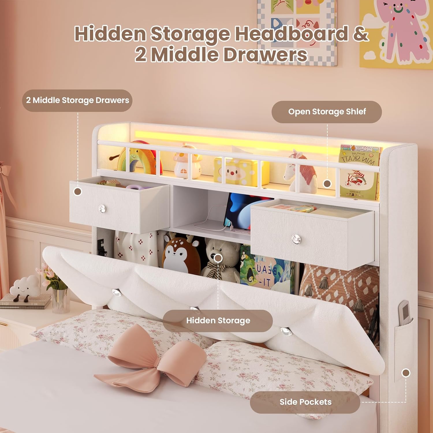 - The headboard features open storage shelves, two middle drawers, and a hidden storage compartment.