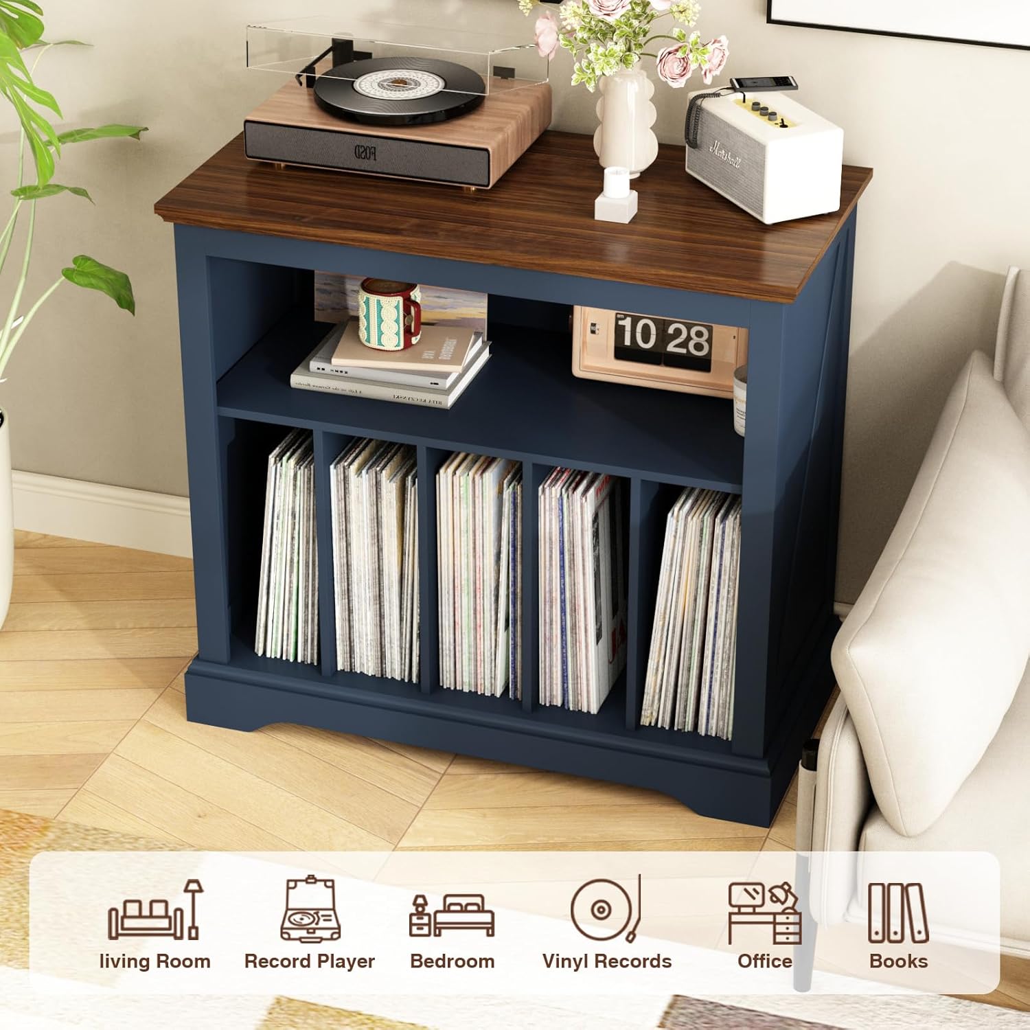 - Vinyl Storage: The bottom section features dividers to organize and secure up to 200-230 vinyl records. Categorize your collection for easy access.