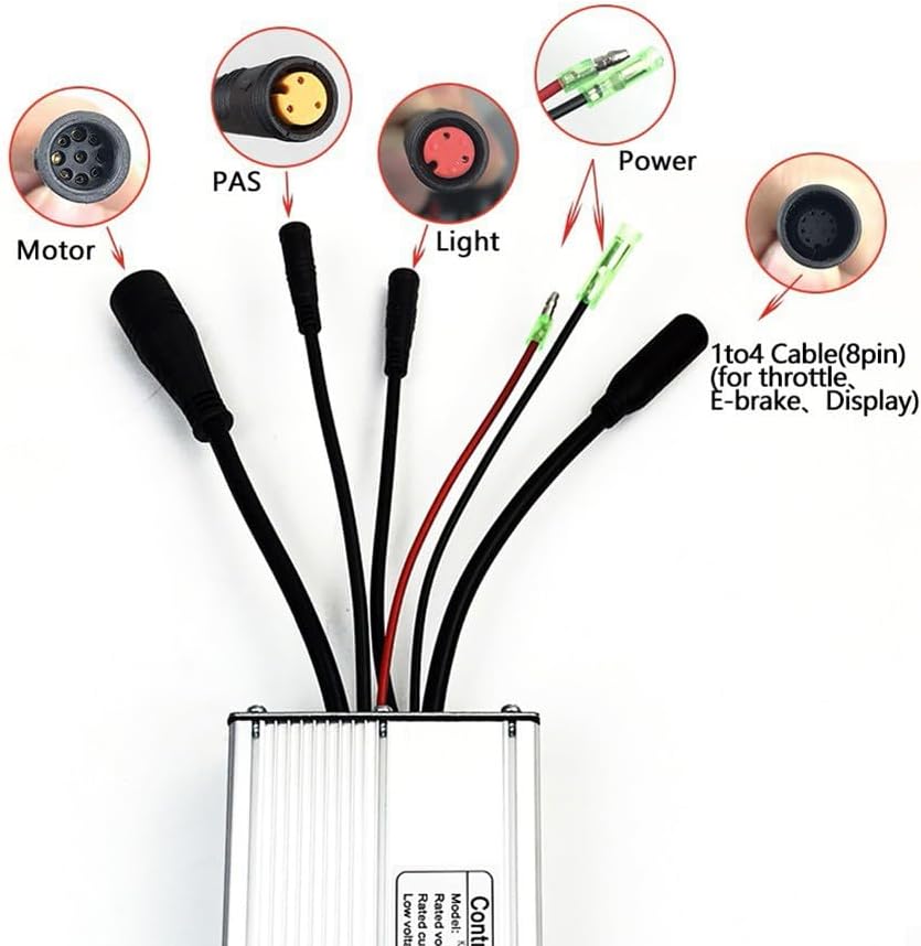 - Connect 1-to-4 Cable: Connect the 8-pin 1-to-4 cable to your throttle, e-brake levers, and the KT LCD display. This controller must be used with a KT display (e.g., KT LED790-900S, LCD1-LCD8 series).