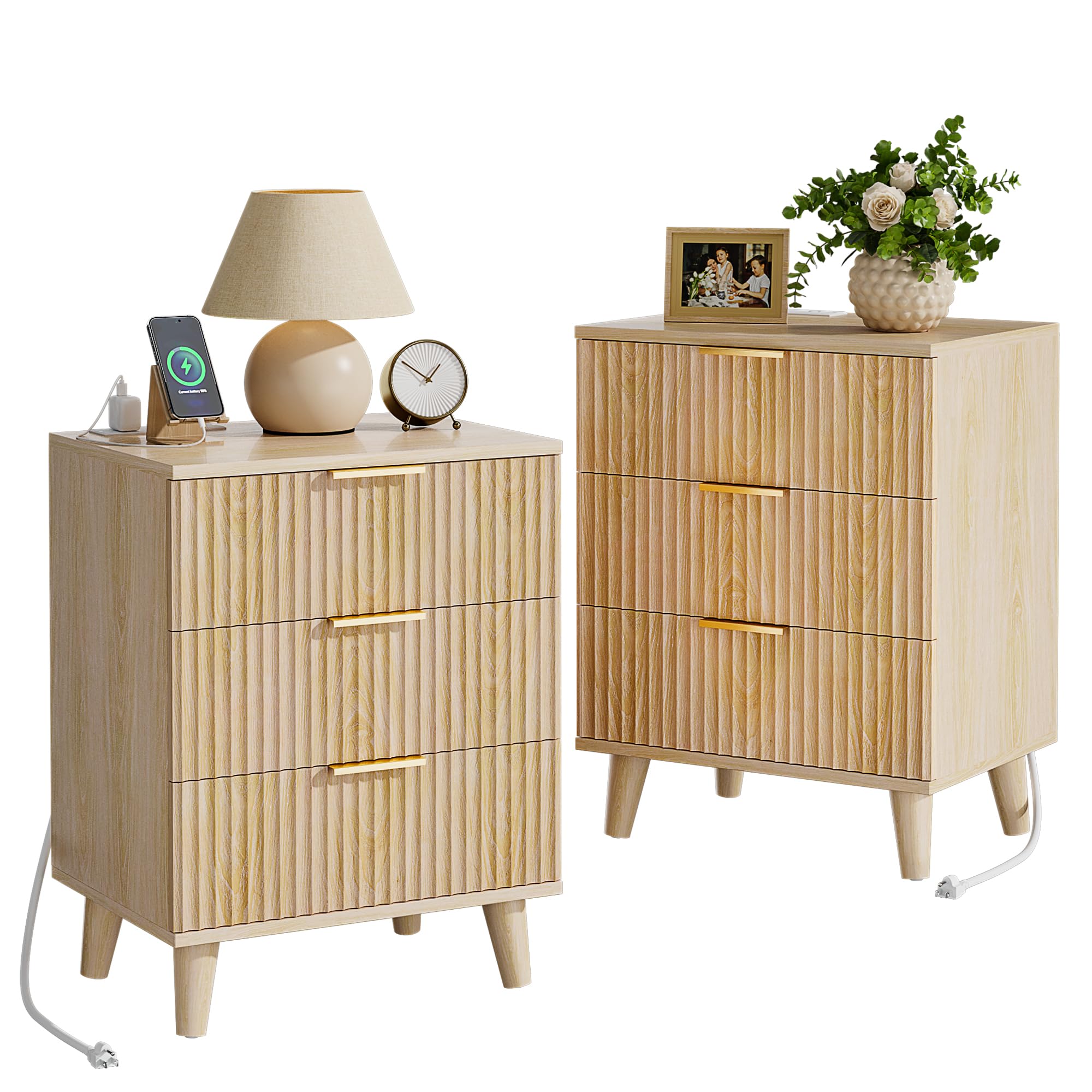 The nightstand features an integrated power panel on the tabletop for easy access to charging. It includes 2 AC outlets (125V/12A) and 2 USB ports (5V/2.1A).