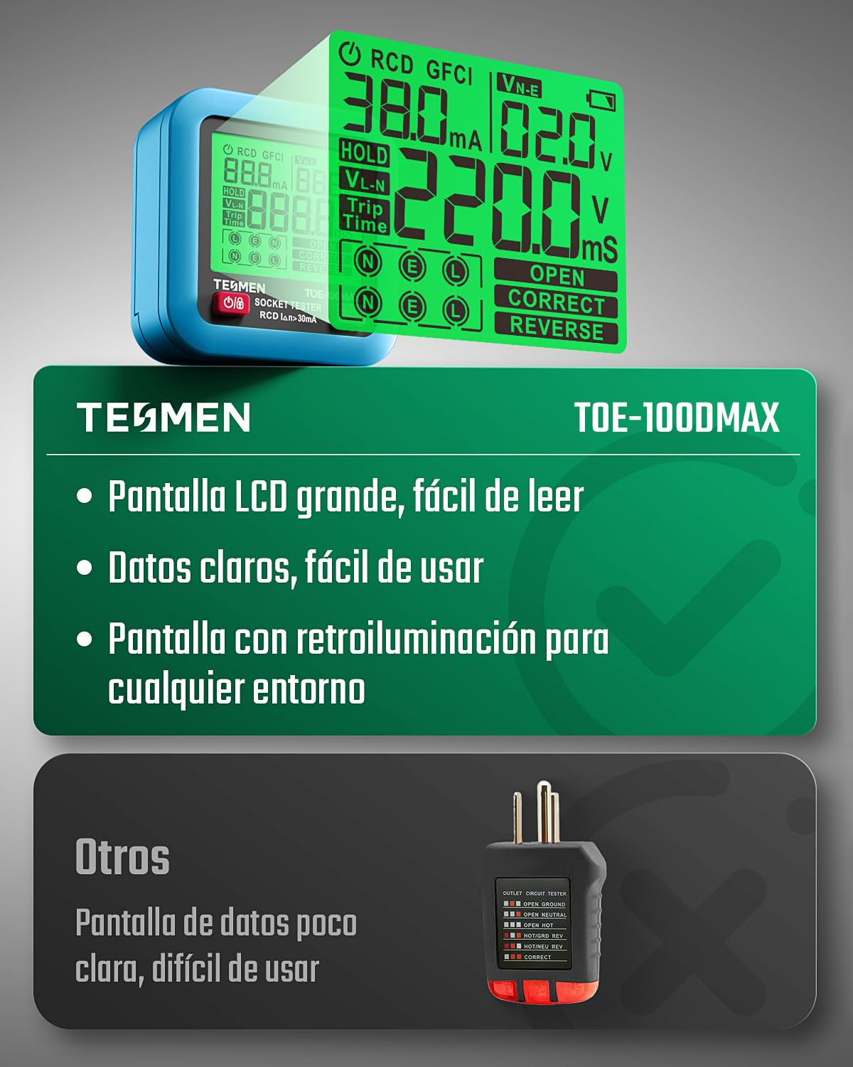 The TESMEN TOE-100DMAX is an intelligent digital socket tester designed for comprehensive electrical safety inspections. This device integrates essential functions such as wiring verification, voltage measurement, and Residual Current Device (RCD) testing. It is a reliable tool for both professional electricians and home users performing daily safety checks, home renovations, or maintenance tasks.
