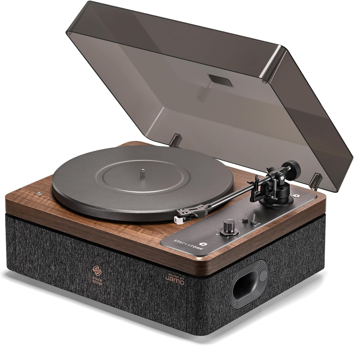 The DS07 combines classic vinyl playback with modern connectivity, featuring integrated Jamo stereo speakers, Bluetooth 5.2, and RCA output for versatile audio experiences.