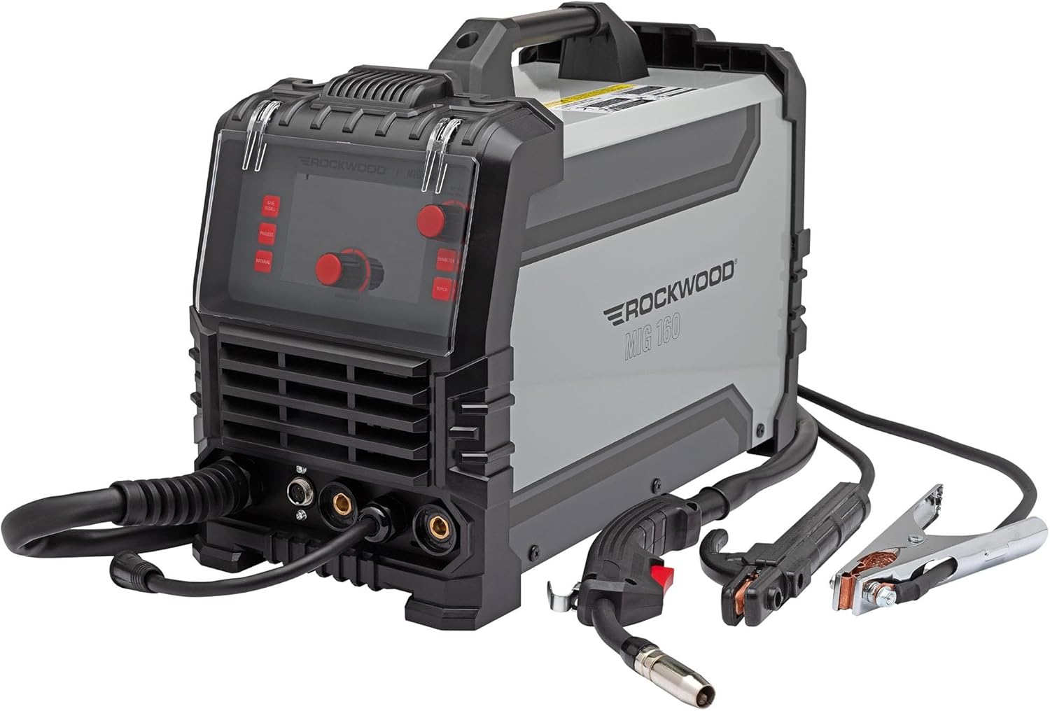 The Rockwood MIG 160 features a digital control panel for easy adjustment of welding parameters. The display shows current settings, and dedicated buttons allow selection of process, material, and wire diameter.