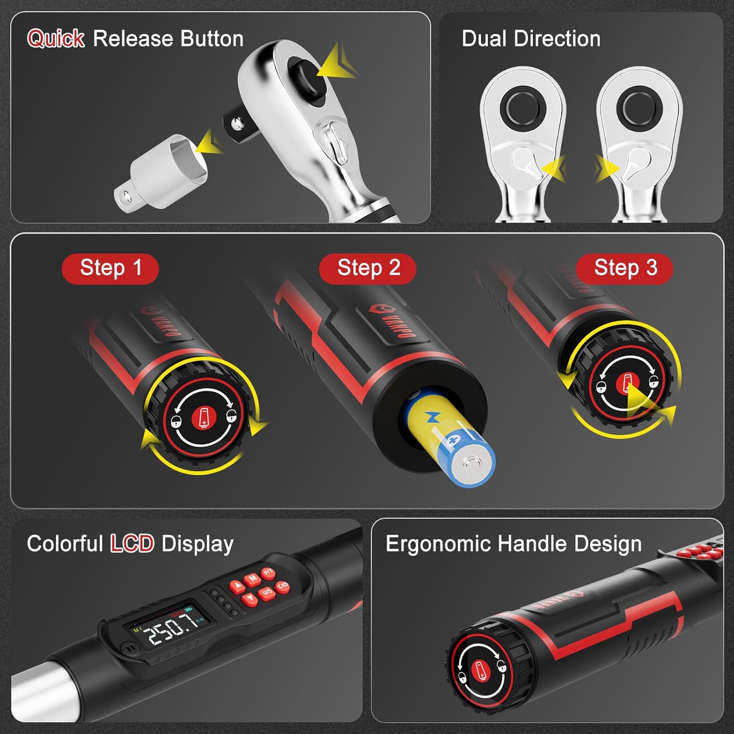 - Clear Torque Feedback: Features a large backlit LCD display, audible alerts, LED indicators, and vibration feedback for clear confirmation when preset torque is reached.