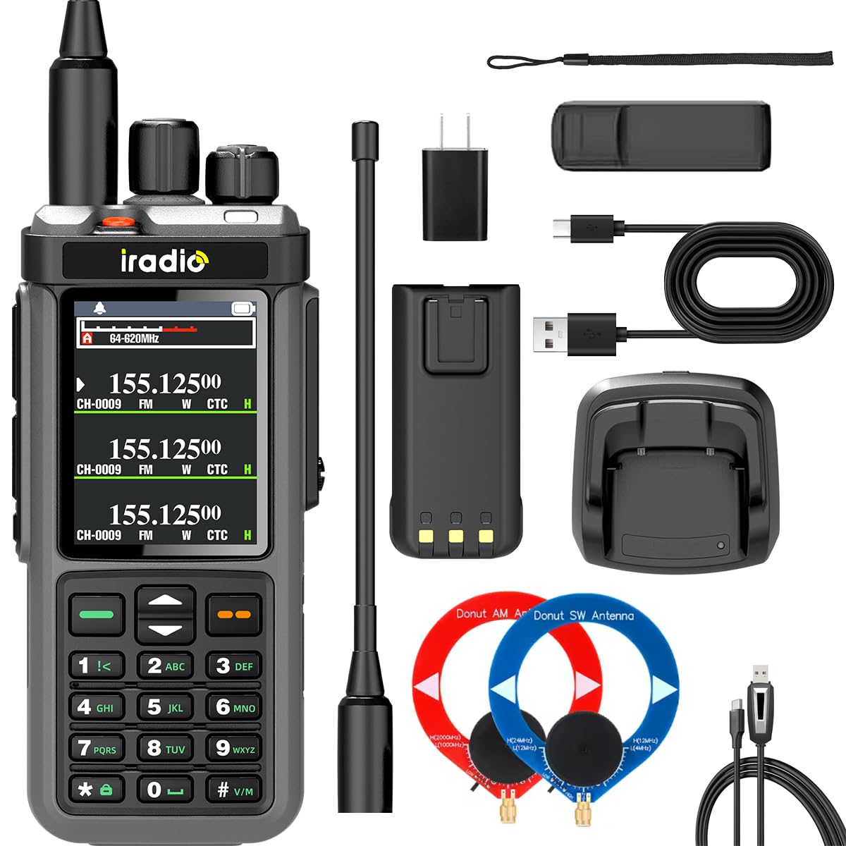 - LCD Display: Shows frequency, channel, battery status, and other operational information.