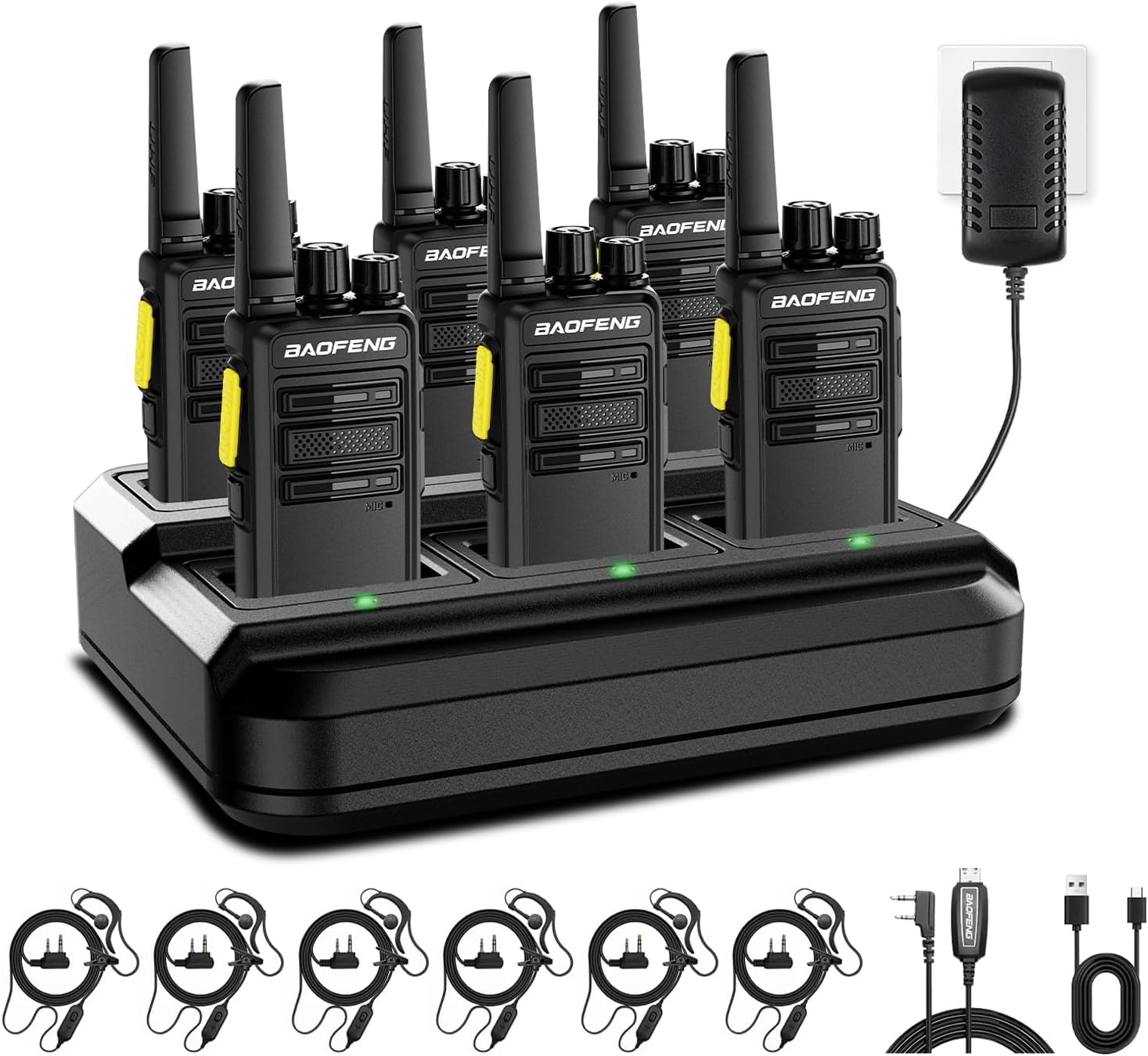 Figure 1.1: The BAOFENG BD-V12B FRS Two-Way Radio package, including six radios and the multi-unit charger.
