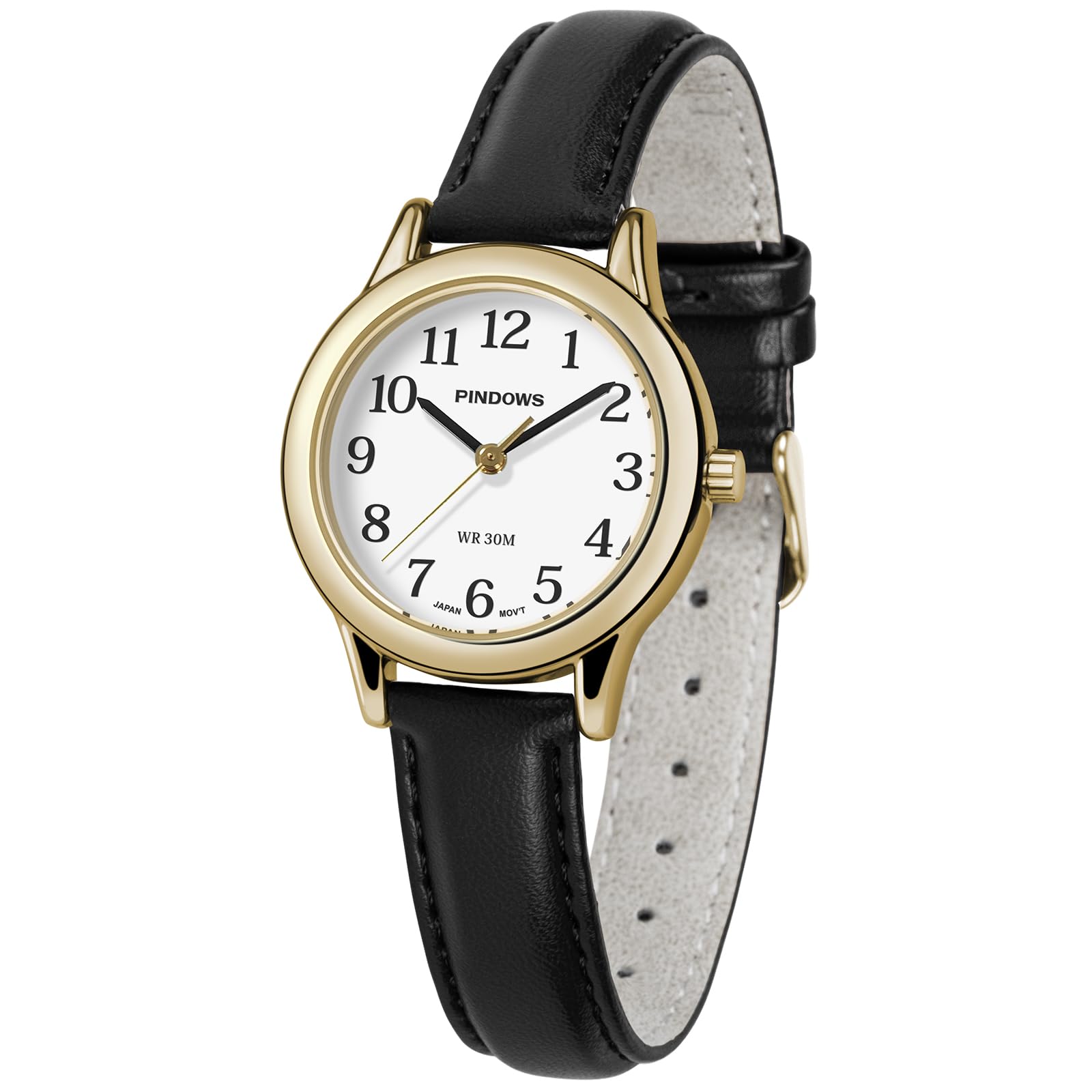 The PINDOWS G652N1 is a minimalist quartz analog watch designed for everyday elegance. It features a gold-tone case, a clear dial with easy-to-read numerals, and a comfortable black leather strap. The watch is equipped with a reliable Japanese quartz movement and a luminous dial for visibility in low-light conditions.