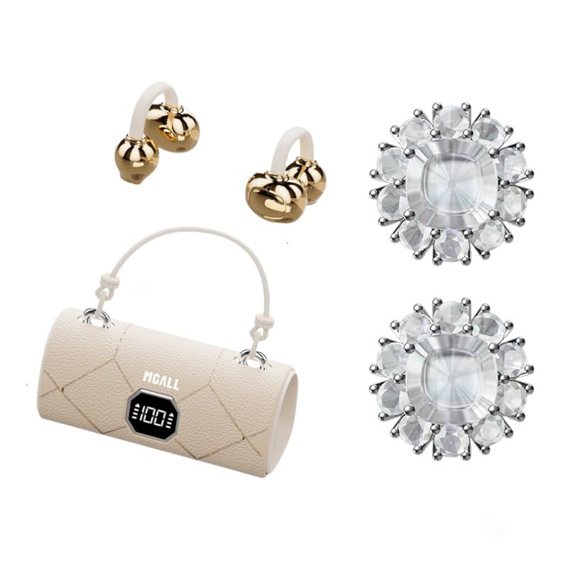 MGALL X22 Clip On Wireless Headphones in their charging case, showcasing the unique handbag-style design and open-ear earbuds.