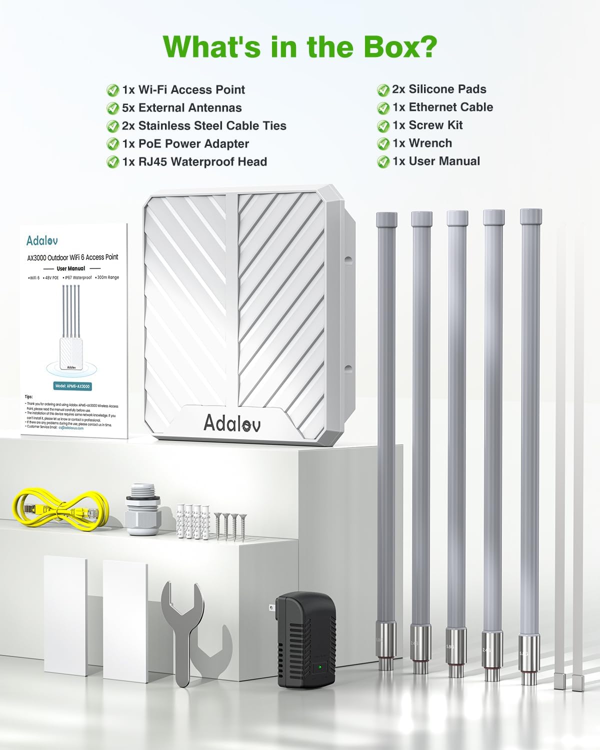 Image 1: All components included in the AdaLov AX3000 Outdoor Wireless Access Point package.