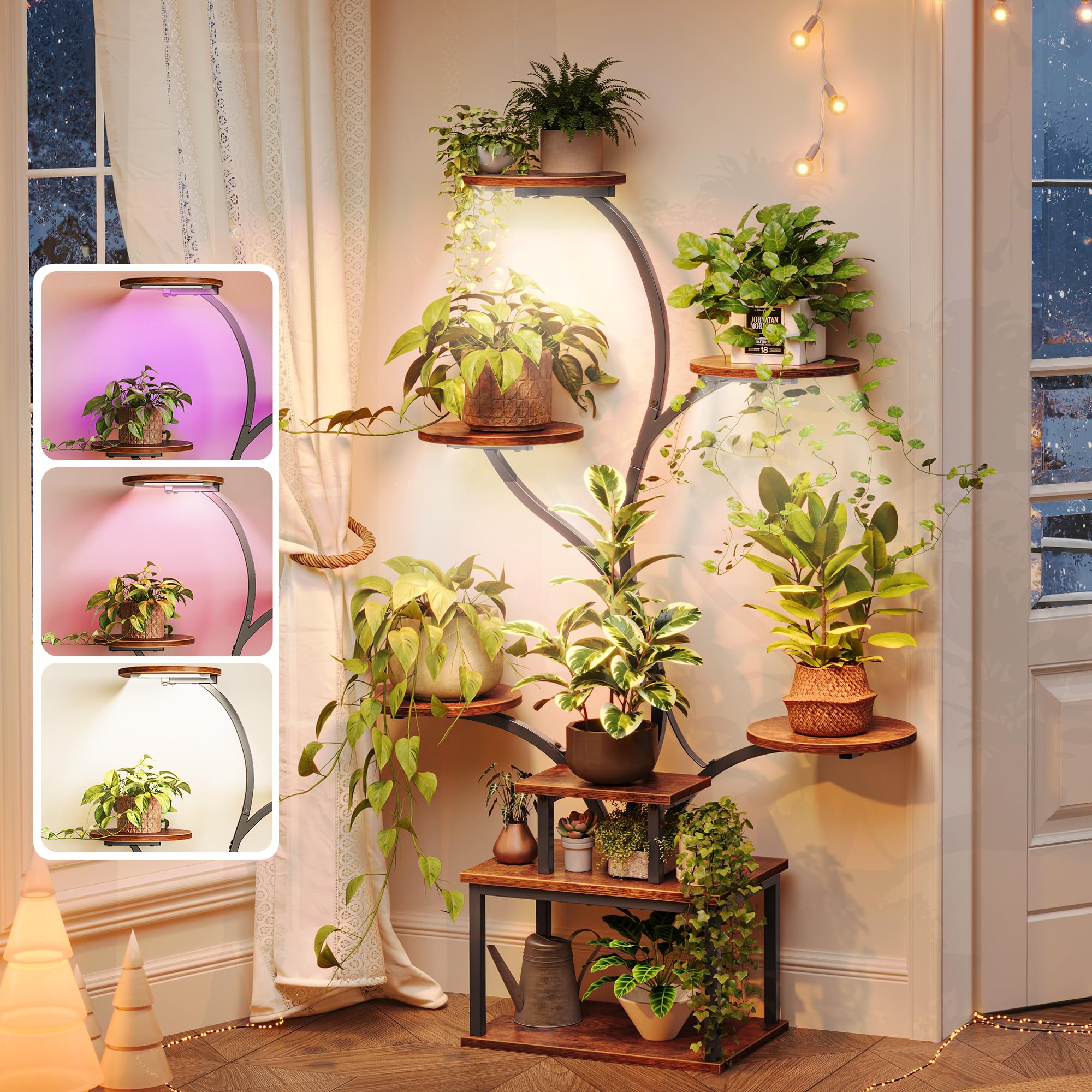 Image: The PRAISUN 51 Inch Plant Stand with Grow Lights in Rustic Brown, showcasing its curved design and multiple shelves.