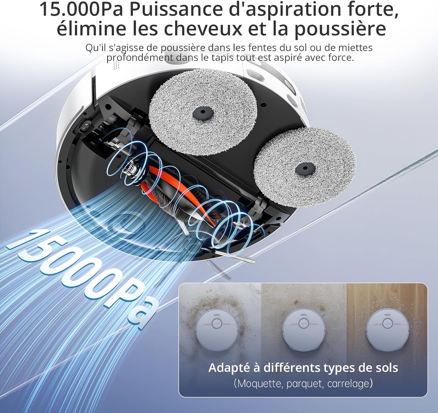 Carpet Detection: The robot automatically detects carpets and adjusts suction power. During mopping, it intelligently lifts the mop pads by 10mm to avoid wetting carpets.