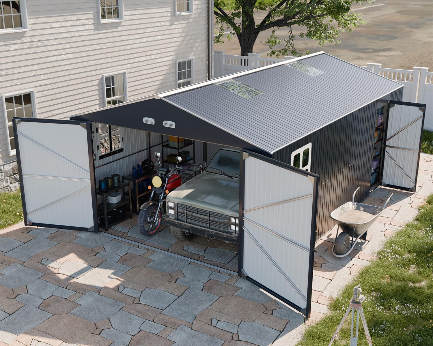 - Dual-Entry Doors: The shed features a wide front double door for vehicle and large equipment access, and a separate personal side door for convenient walk-in entry. Both doors are equipped with anti-theft hardware and are fully lockable. Always ensure doors are securely closed and locked when not in use.