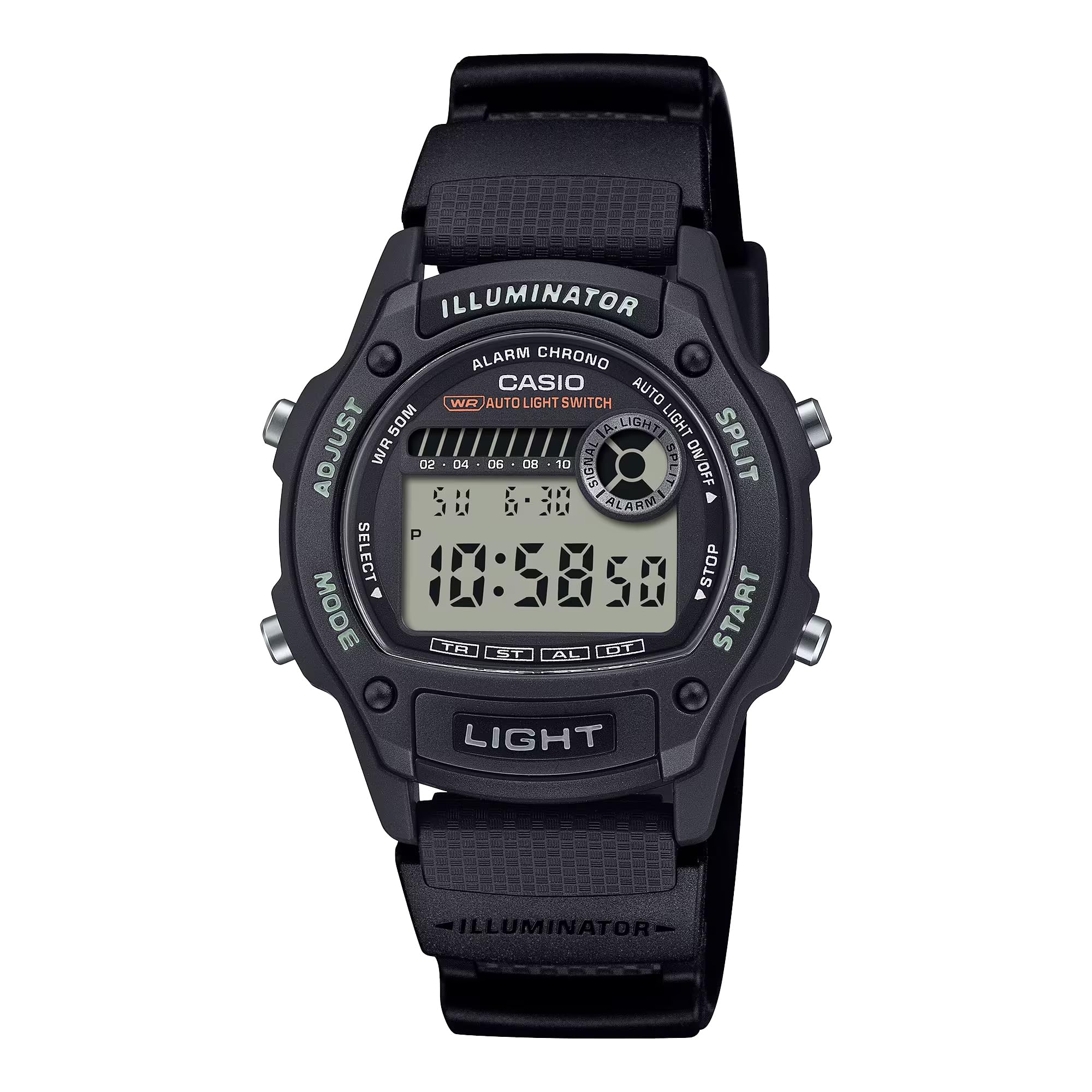 Figure 2.1: Front view of the Casio W220H Illuminator Digital Watch. The watch features a black resin case and band, with a clear digital display showing time and date. Buttons are visible on both sides of the case.