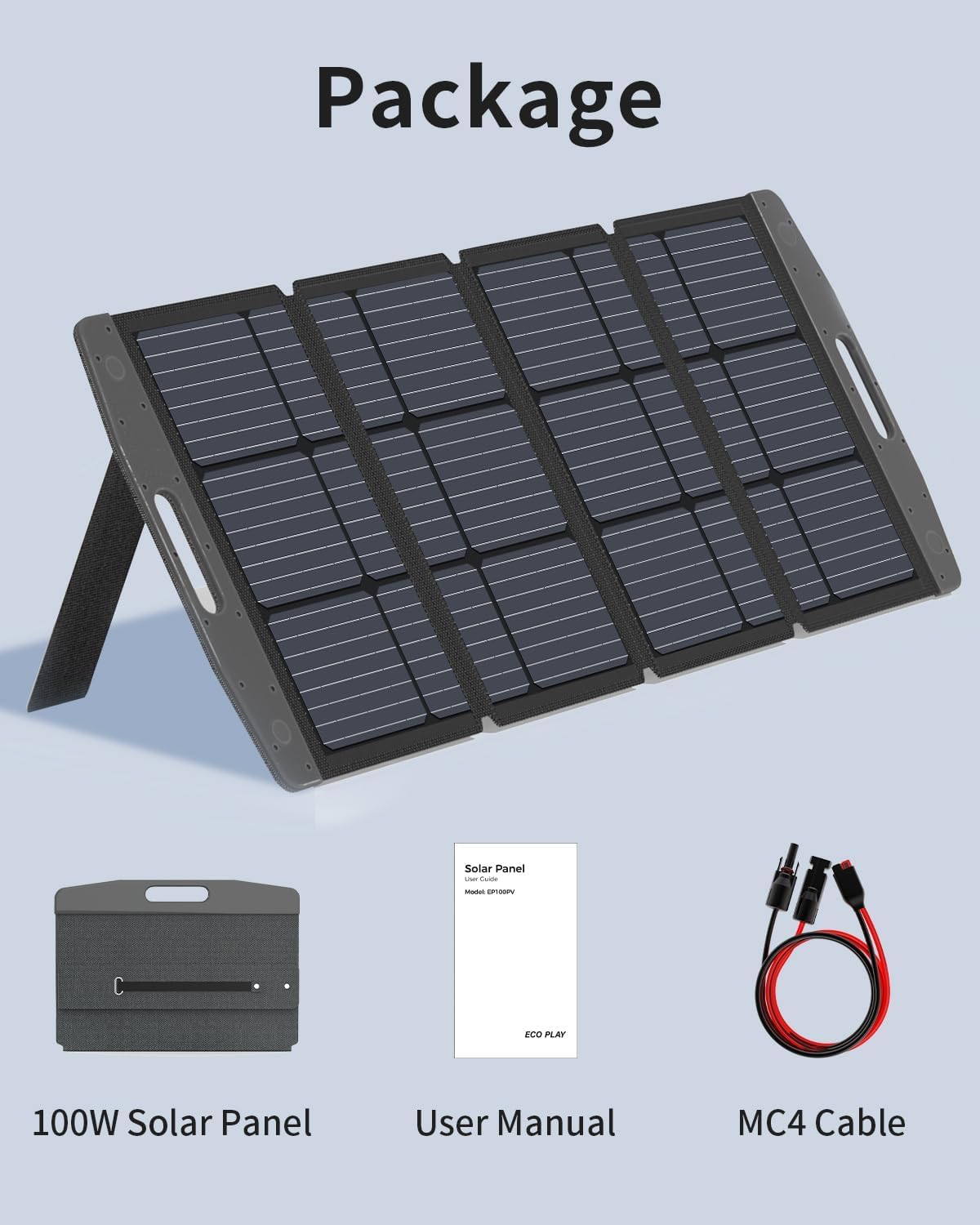 Thank you for choosing the Eco Play Foldable 100W Solar Panel Charger Kit. This manual provides essential information for the safe and efficient operation of your solar panel. Please read it thoroughly before use and retain it for future reference.