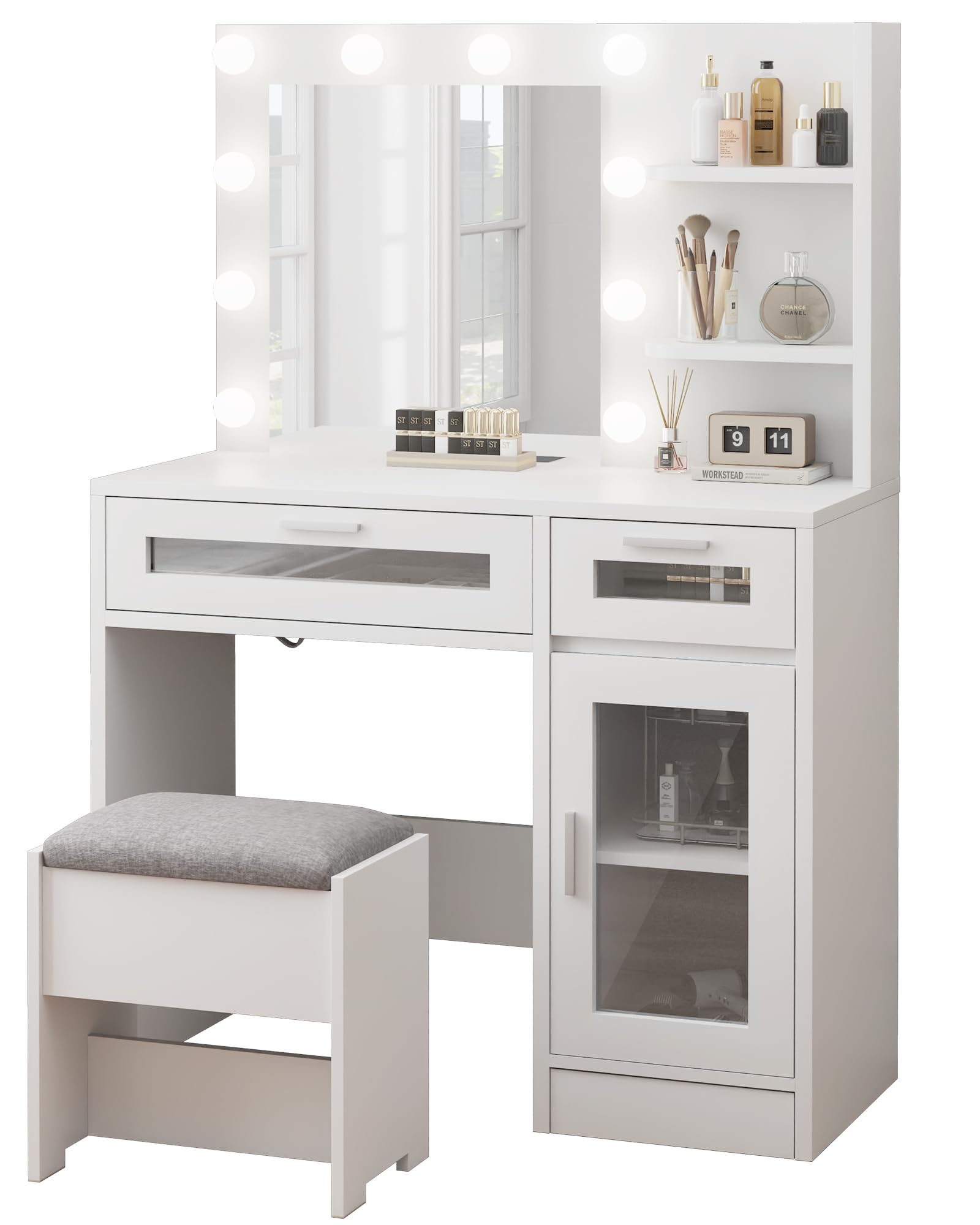 - Drawer and Shelf Usage: The desk includes multiple drawers and shelves for storage. Pull drawers gently to open and push to close. Arrange your cosmetics and accessories on the shelves for easy access.