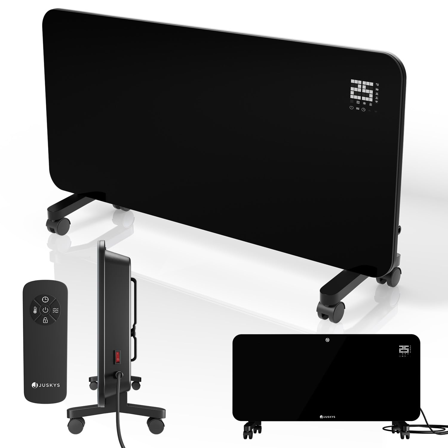 Figure 1: Juskys 2000W Glass Infrared Heater. This image displays the sleek black glass panel heater, highlighting its modern design and the integrated LED display. A remote control is also visible, indicating the various control options available to the user.