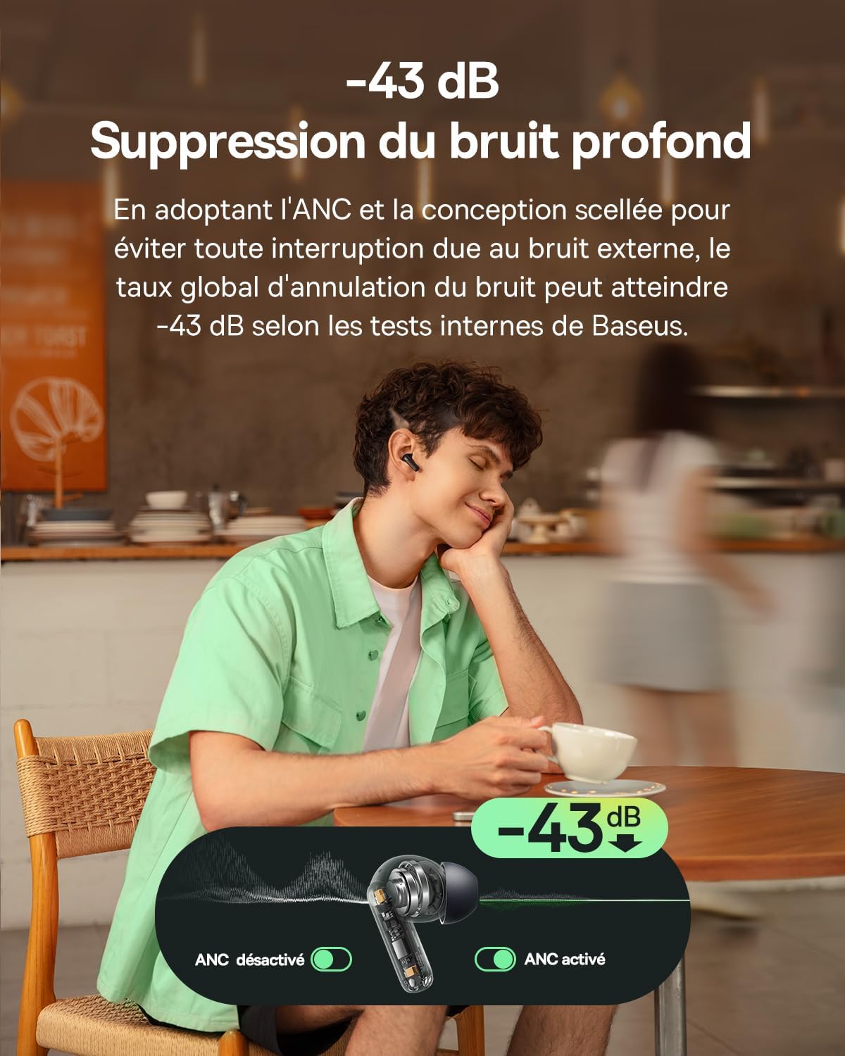 Image: The Baseus EP10 NC earbuds feature -43 dB deep noise cancellation, effectively blocking external sounds for an immersive listening experience. The image shows a user enjoying music in a cafe with ANC activated.