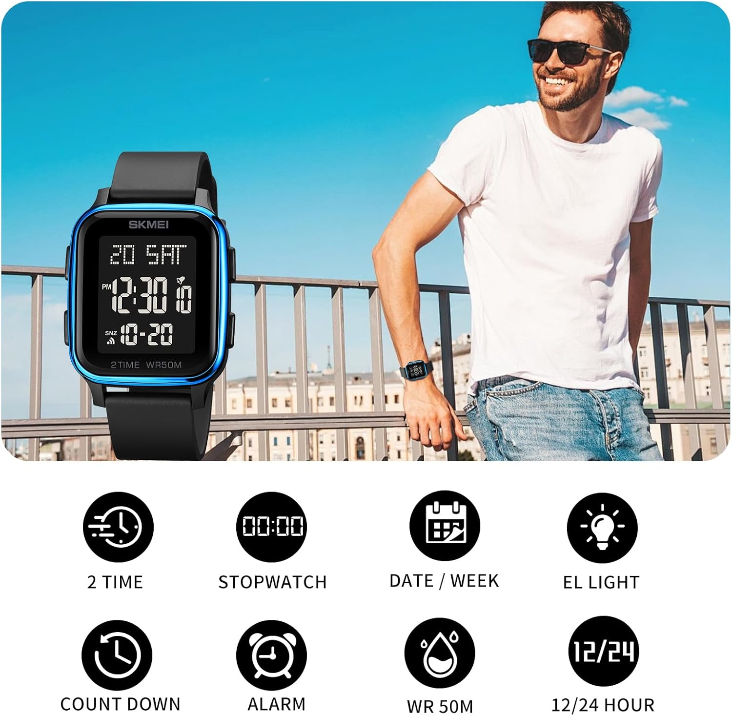 Figure 1: Key Features. This image highlights the main functionalities of the SKMEI 1858 watch, including dual time, stopwatch, date display, EL light, countdown timer, alarm, 50M water resistance, and 12/24 hour format.