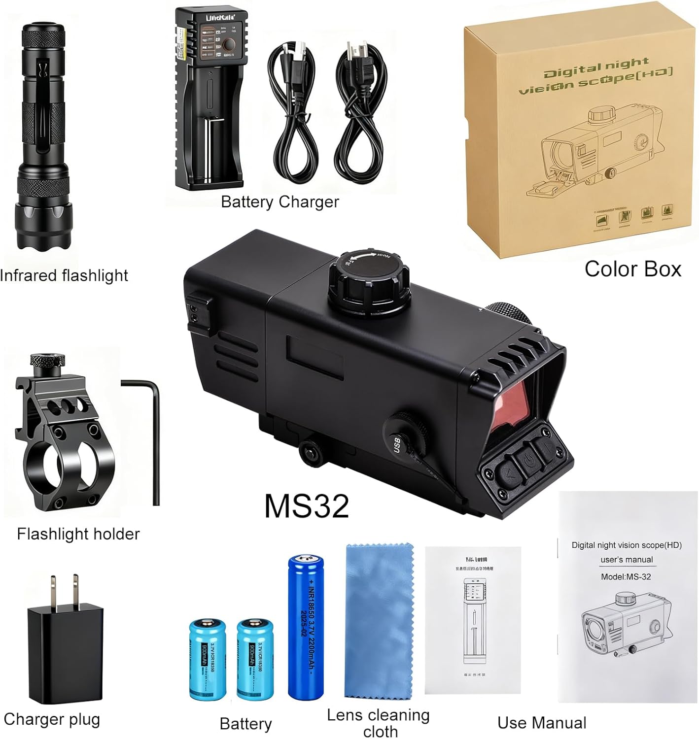 - Included Components: MS32 night vision scope, infrared flashlight