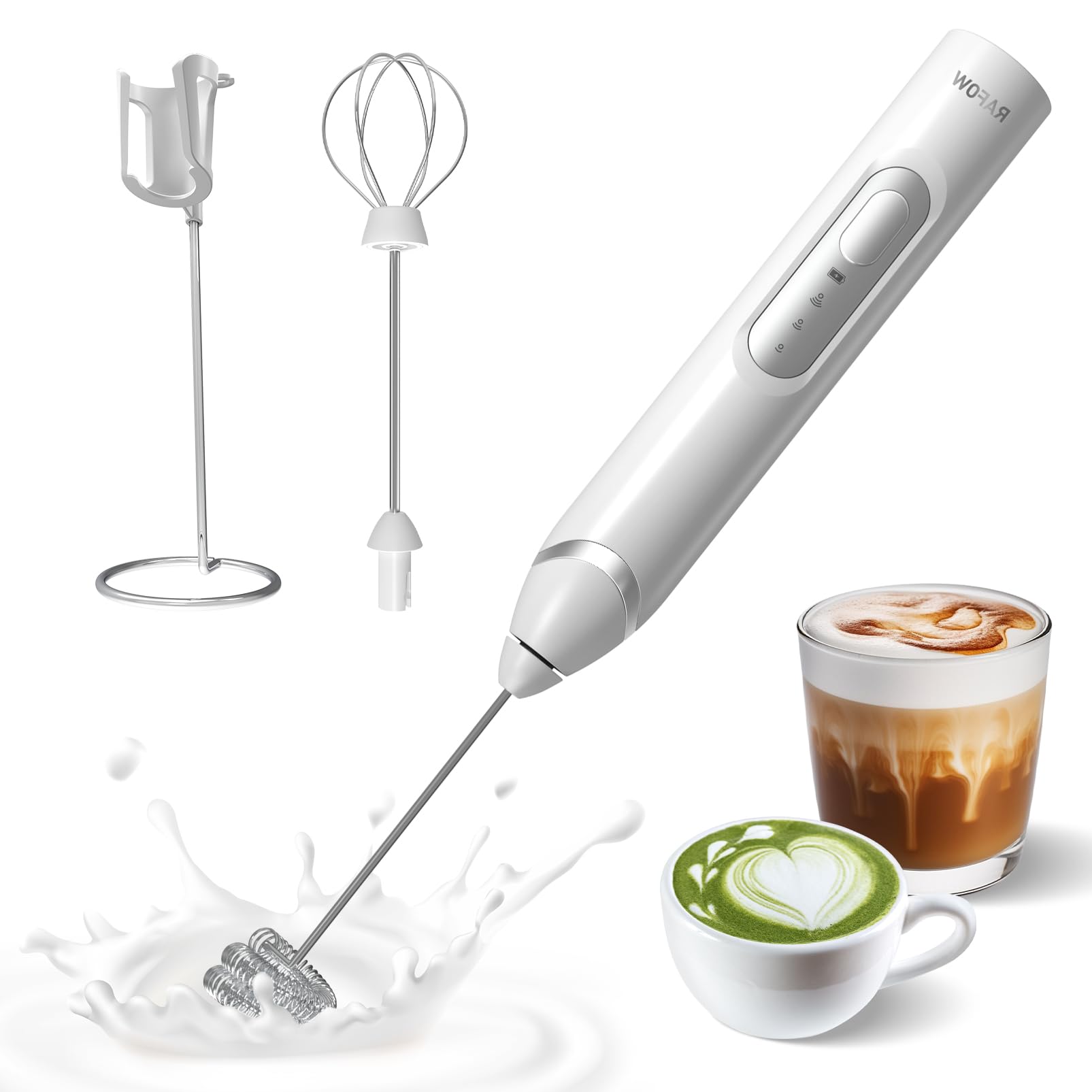 Video: This official product video demonstrates the RAFOW Handheld Electric Milk Frother in use, showcasing its one-touch frothing, three-speed versatility, dual detachable whisks, and USB-C charging. It provides a visual guide to operating the device and achieving various frothing results.