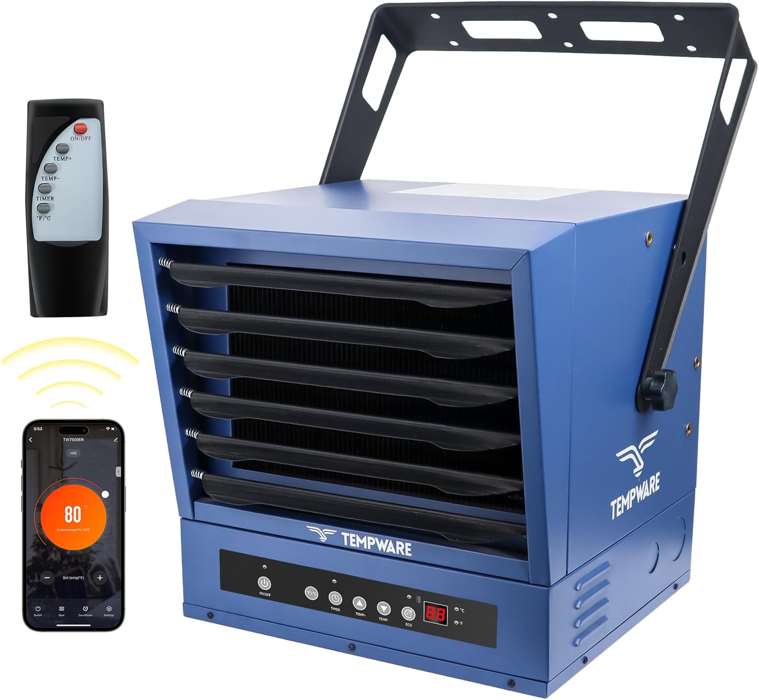 Image 3.1: The TEMPWARE 10000W Electric Garage Heater, showcasing its main unit, remote control, and smartphone app interface.