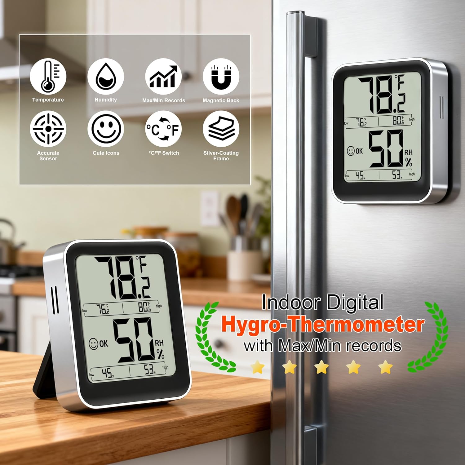- User-Friendly Design: Includes a tabletop stand and magnetic back for versatile placement. Features a clear, non-backlit display and a °F/°C selector.