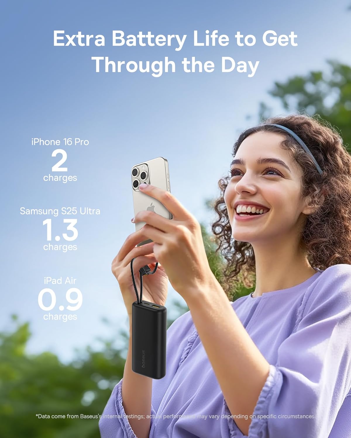 - Built-in Dual USB-C Cables: Features two integrated USB-C braided cables for convenient charging without needing to carry extra cables. These cables also serve as a carrying strap.