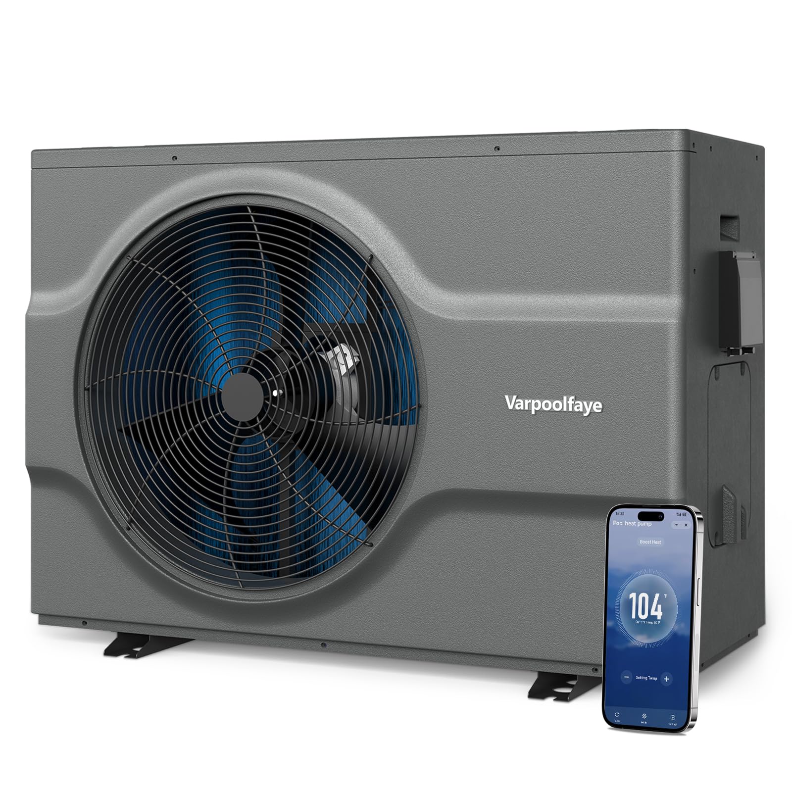 The Varpoolfaye 120000 BTU Inverter Electric Pool Heater is an energy-efficient heat pump designed for both inground and above-ground pools up to 33,000 gallons. It utilizes inverter technology for stable heating and cooling, lower energy consumption, and quiet operation. The unit features a smart touch control panel and WiFi connectivity for remote management.