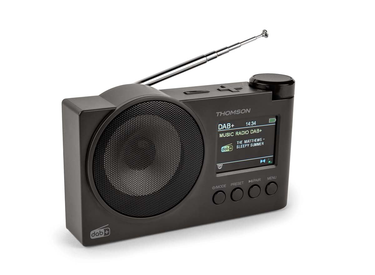Figure 1.1: THOMSON RT400DABBTBK portable radio. This image shows the front of the radio, featuring the speaker grille on the left and the LED display with control buttons on the right. The display indicates the time, date, and battery level.