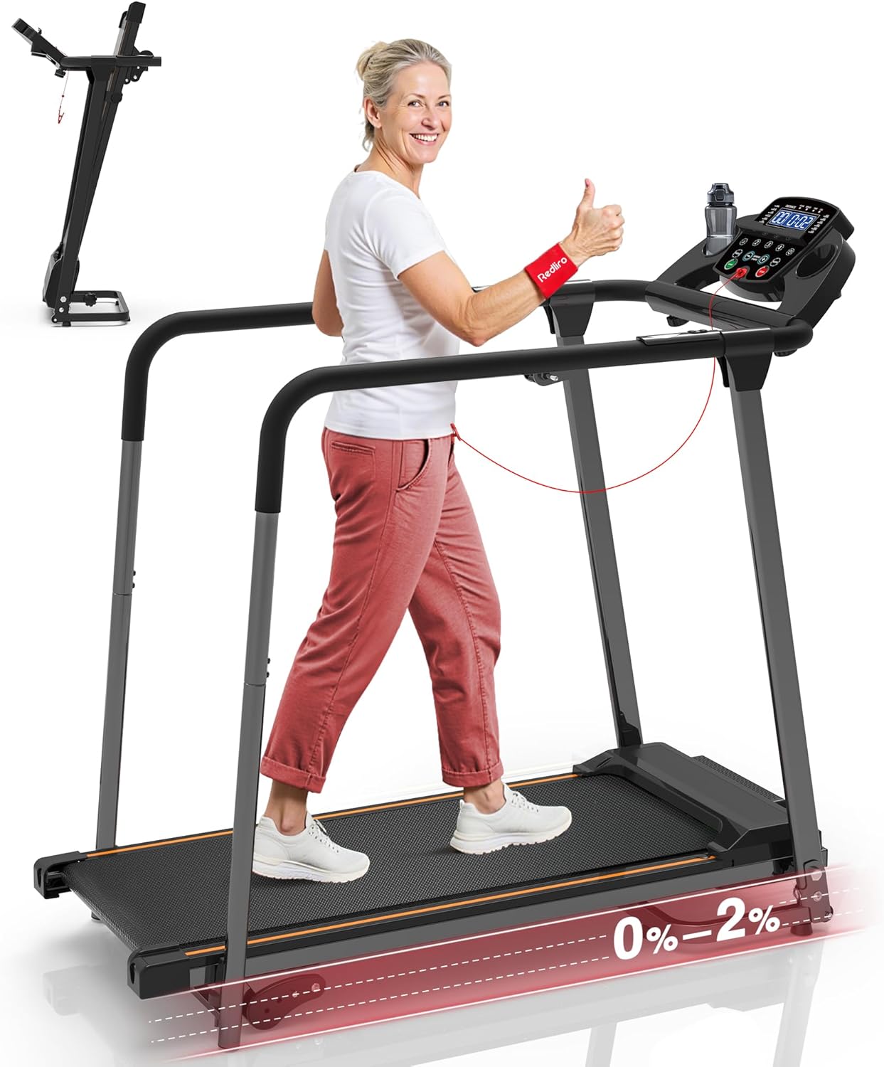 This manual provides essential information for the safe and effective use of your REDLIRO Walking Treadmill, Model JK14F. Designed with a focus on safety and ease of use, this foldable treadmill features long handrails, adjustable incline, and a user-friendly console, making it suitable for seniors and individuals undergoing home recovery or seeking general fitness.